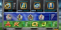 Надо сказать, что еще никогда так много узнаваемых спортивных персоналий не собиралось на одном видео-слоте. Игра начинается с выбора команды, представленной своим выдающимся игроком и далее эти веселые шаржированные, но чрезвычайно похожие портреты используются как основные символы на вращающихся барабанах. Пеле в желто-зеленой униформе, Марадонна со своими латинским кудрями, в традиционной аргентинской полосатой бело-голубой форме, неизменные нулевка Зидана, усы Феллера и стильная бородка Баджио. Добавим, что итальянец здесь не единственный. "Wild"-символом выступает знаменитый итальянский арбитр Пьерлуиджи Коллина, также вполне узнаваемый мультяшный персонаж. Иконка "Золотой мяч" работает символом скаттера. Стадион славы - "Bonus", а главный трофей - чемпионский кубок - дает свободные вращения. На дополнительных символах изображены стандартные знаки карточной колоды "J", "Q", "K" и "A", на этот раз без десятки. Все дополнительные знаки изображены в стильной спортивной интерпретации, каждый с золотым декором из предметов футбольной атрибутики: судейским свистком, бутсами, вратарскими перчатками и мячом. Стоит добавить, что выбор одной команды из пяти перед игрой - это не условность. Выбранный футболист будет на стороне игрока во время бесплатных вращений и бонусного раунда, в то время как остальные четверо останутся стандартными символами.