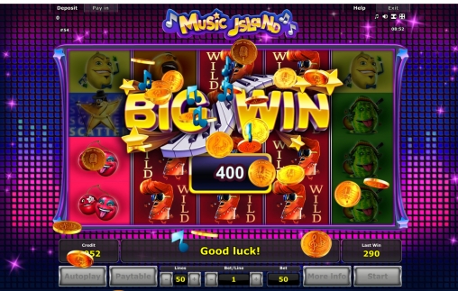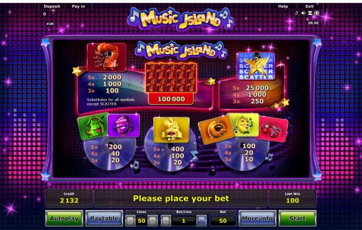 Music Island может заинтересовать пользователей очень длинными полосами картинок на барабанах, благодаря чему здесь часто образуются многочисленные комбинации в одном спине. Особенно радуют стеки джокеров. Отсутствие фри-спинов и дополнительных бонусов нисколько не расстраивает.