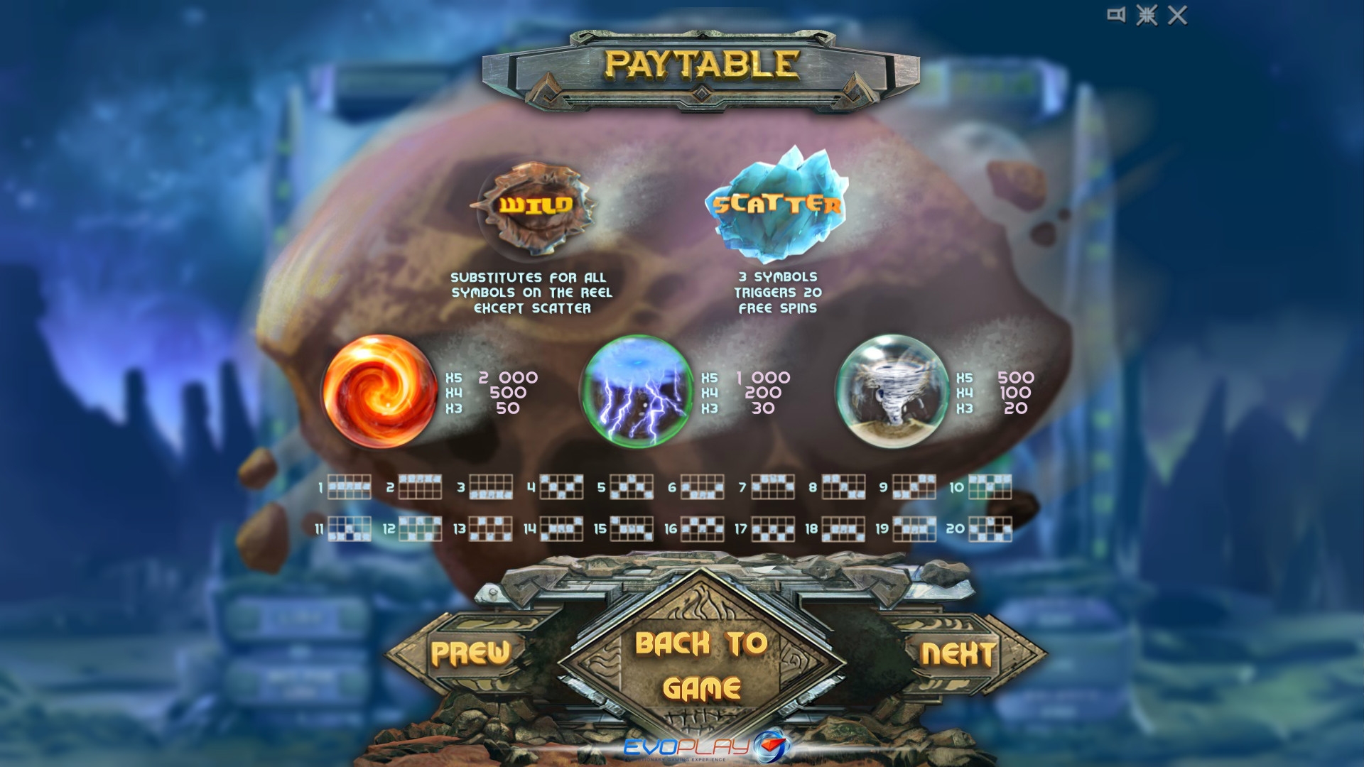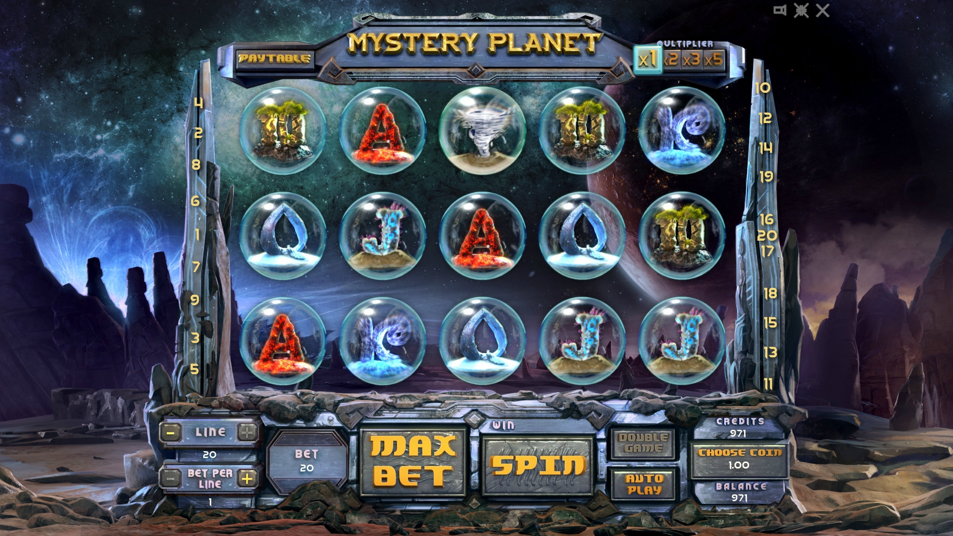 «Таинственная планета» - это 5-барабанный автомат с двадцатью линиями и пятнадцатью символами на экране. При этом задействовать можно одну, три, пять, девять, пятнадцать или все двадцать полос, на которых в процессе игры образуются комбинации.