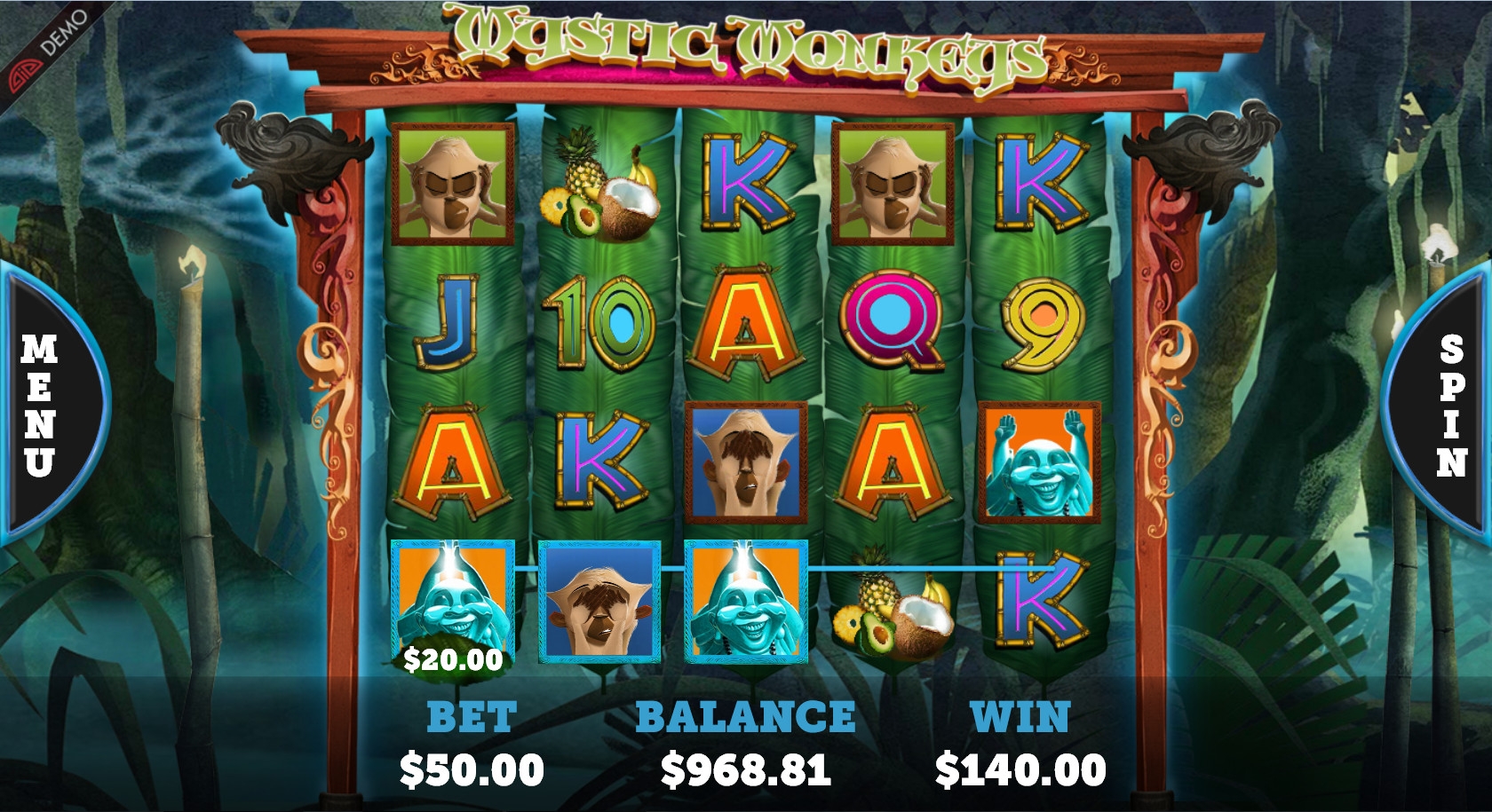 Для расчета выигрыша ставка по этой полосе умножается на коэффициент комбинации, который в Mystic Monkeys может быть от х5 до х750. Вся сумма, выигранная за спин, по его окончанию сразу оказывается на счету клиента.