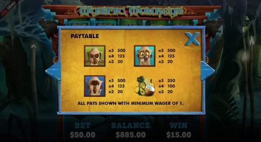 «Таинственные обезьяны» представляет собой бесплатный игровой автомат с пятью барабанами, пятьюдесятью линиями и четырьмя рядами изображений на экране. Одновременно после остановки барабанов можно увидеть двадцать картинок.