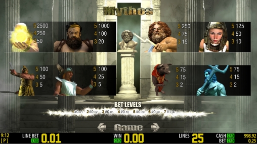 В «Мифологии» пять барабанов и двадцать пять линий. Картинки выстраиваются в три ряда. Набор доступных опций включает в себя простые и особые символы, а также бесплатные спины с утроенными коэффициентами.