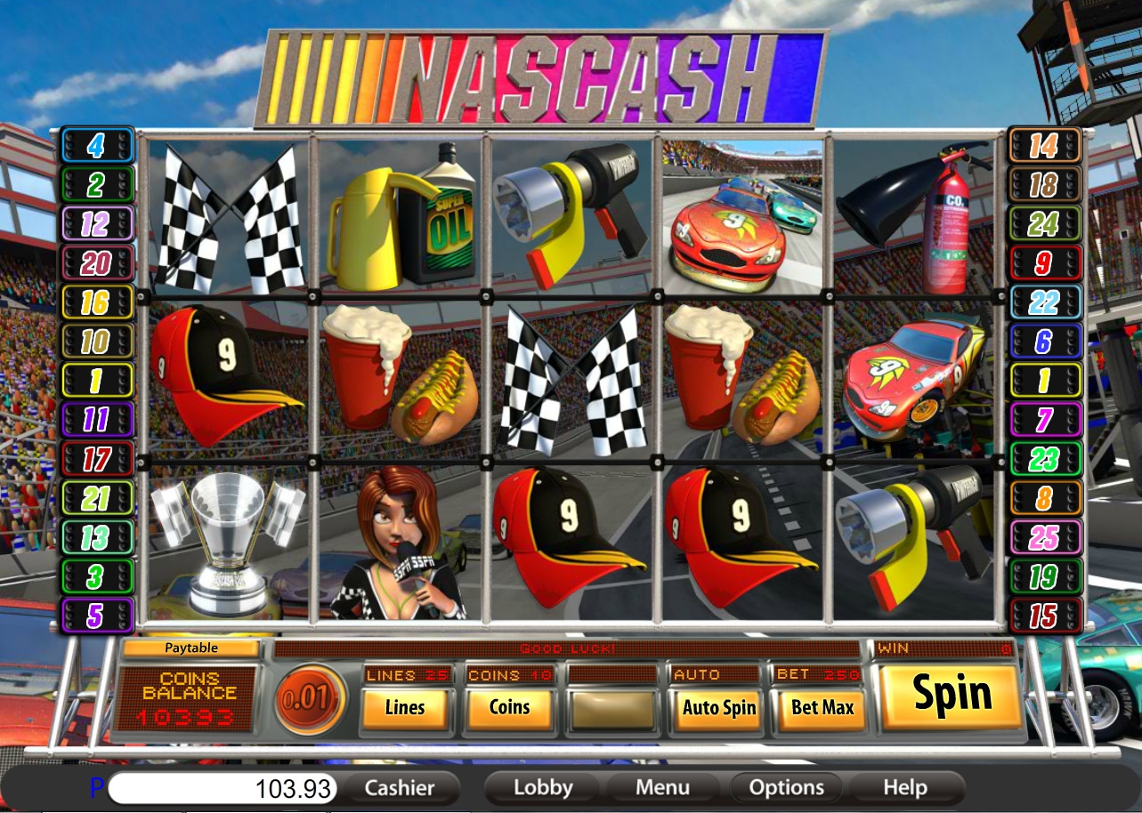 Модель NASCASH предлагает пять барабанов и двадцать пять линий. Количество активных полос разрешается менять по усмотрению клиента. На каждую полосу принимается до десяти монет номиналом один, пять или десять центов. Таким образом, на спин можно поставить не более двадцати пять евро.