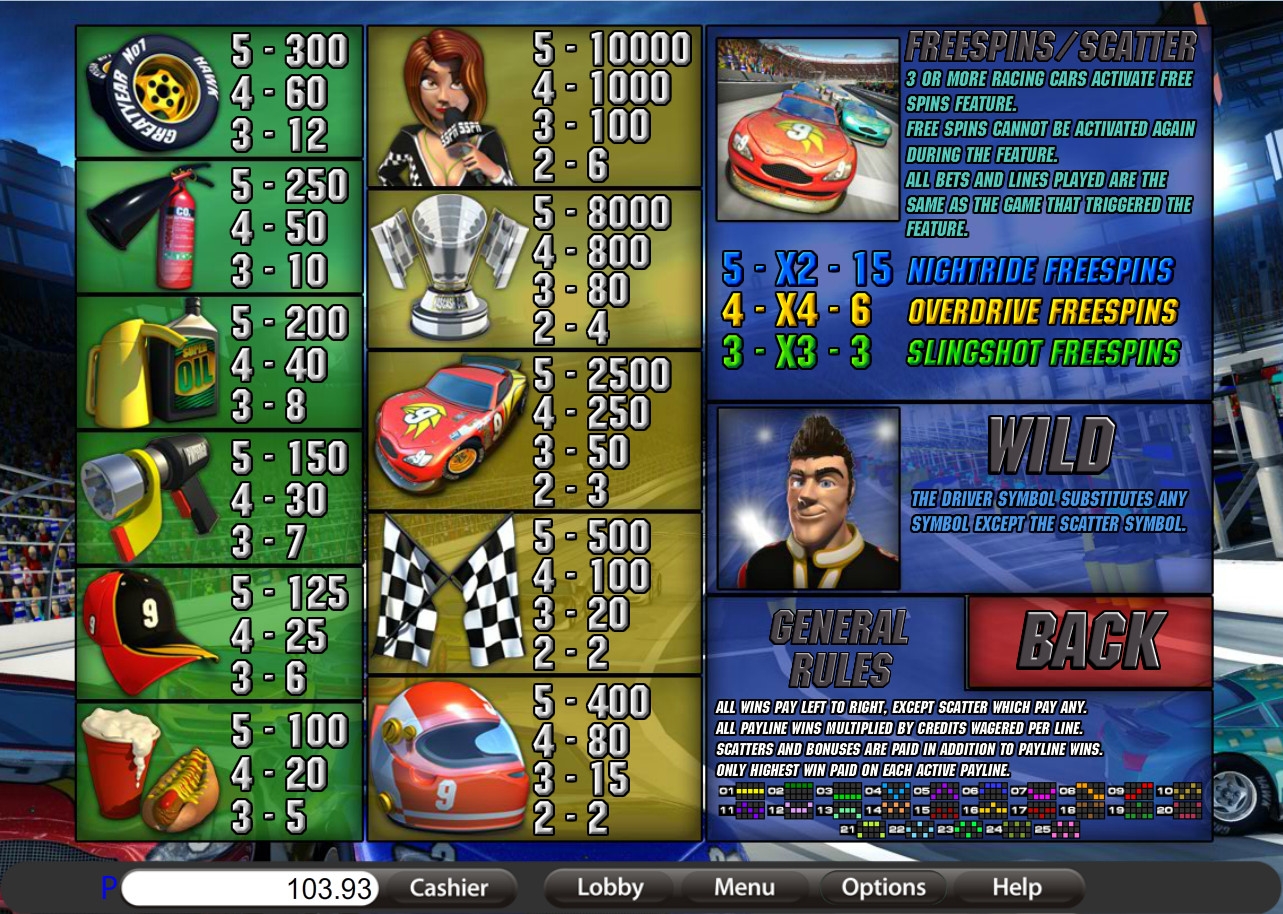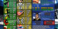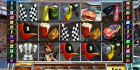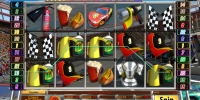 Предметы и персонажи, нарисованные на барабанах игры, так или иначе связаны с автомобильными гонками. Запустив видео-слот, вы увидите колесо, огнетушитель, машинное масло, кепку, шлем, кубок, клетчатые флажки и некоторые другие картинки.