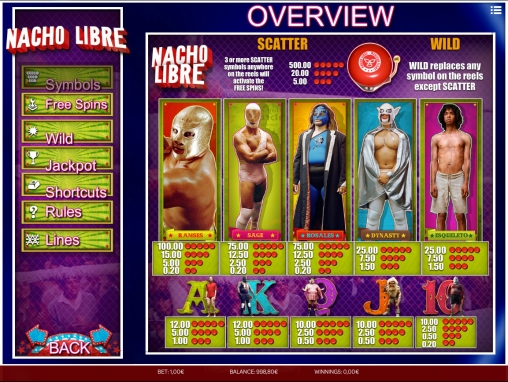 Открыв видео-слот «Суперначо», вы увидите на барабанах пятерых борцов из фильма: Рамзеса, Императора, Скелетто и других. Данные игровые элементы занимают сразу три позиции на барабане. Таким образом, они могут заполнять целую колонку. Также на экране появляются номиналы игральных карт, рядом с которыми также изображены рестлеры.