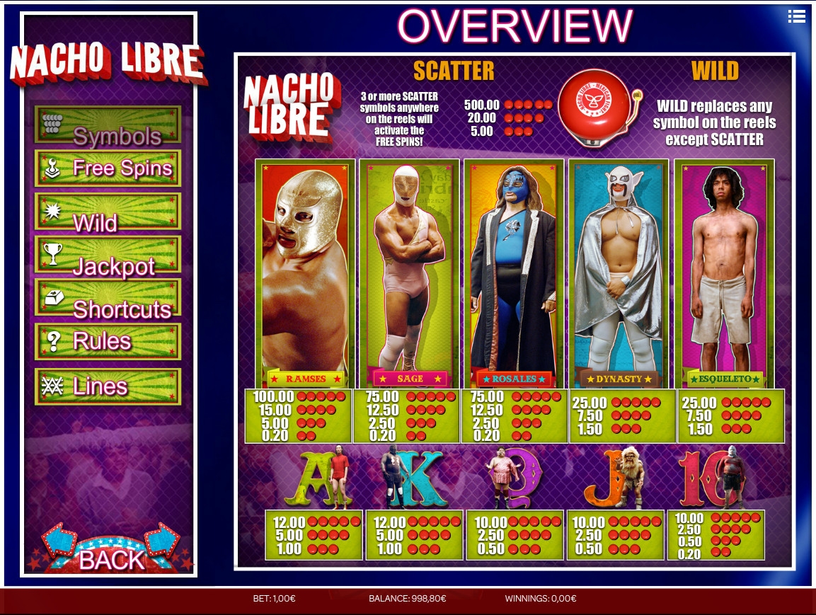 Специальными символами являются Wild (звонок) и Scatter (логотип игры Nacho Libre). Далее пойдет речь об их возможностях: