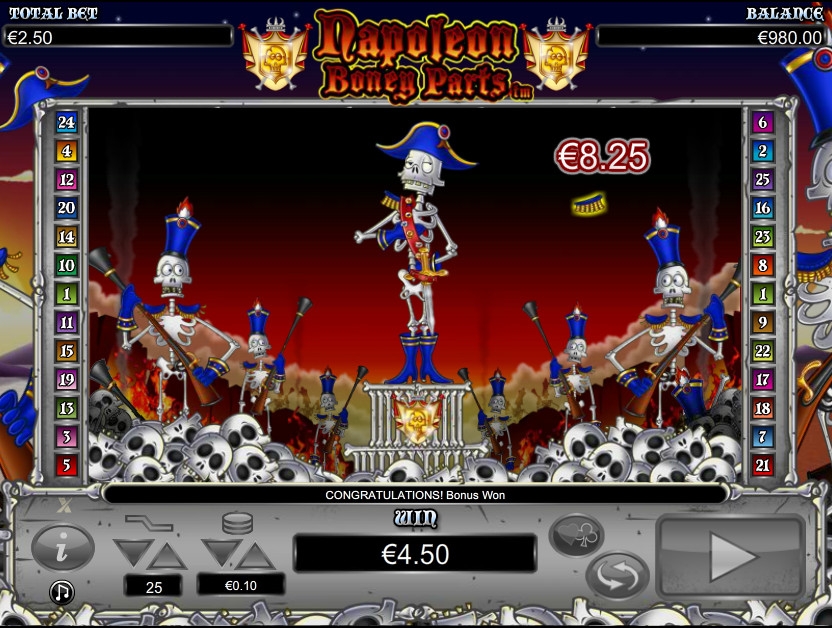 В бонусной игре видео-слота Napoleon Boney Parts на месте барабанов появится дополнительный экран. Наполеон Костопарт поднимется на небольшую трибуну в окружении своего войска скелетов. Вам нужно будет кликать по элементам его амуниции. За это вы будете получать выплаты. Их размер определяется случайным образом и частично зависит от общей ставки на спин, во время которого было получено право на участие в бонусном раунде. Если вам удастся развалить Наполеона, ваш выигрыш существенно увеличится.