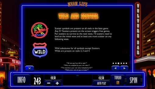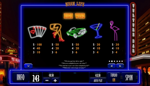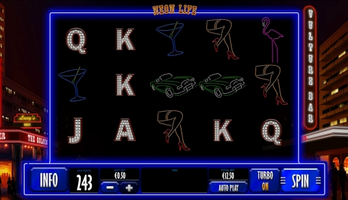 Neon Life – игровой автомат с пятью барабанами и пятнадцатью ячейками для картинок. Активных линий нет.
