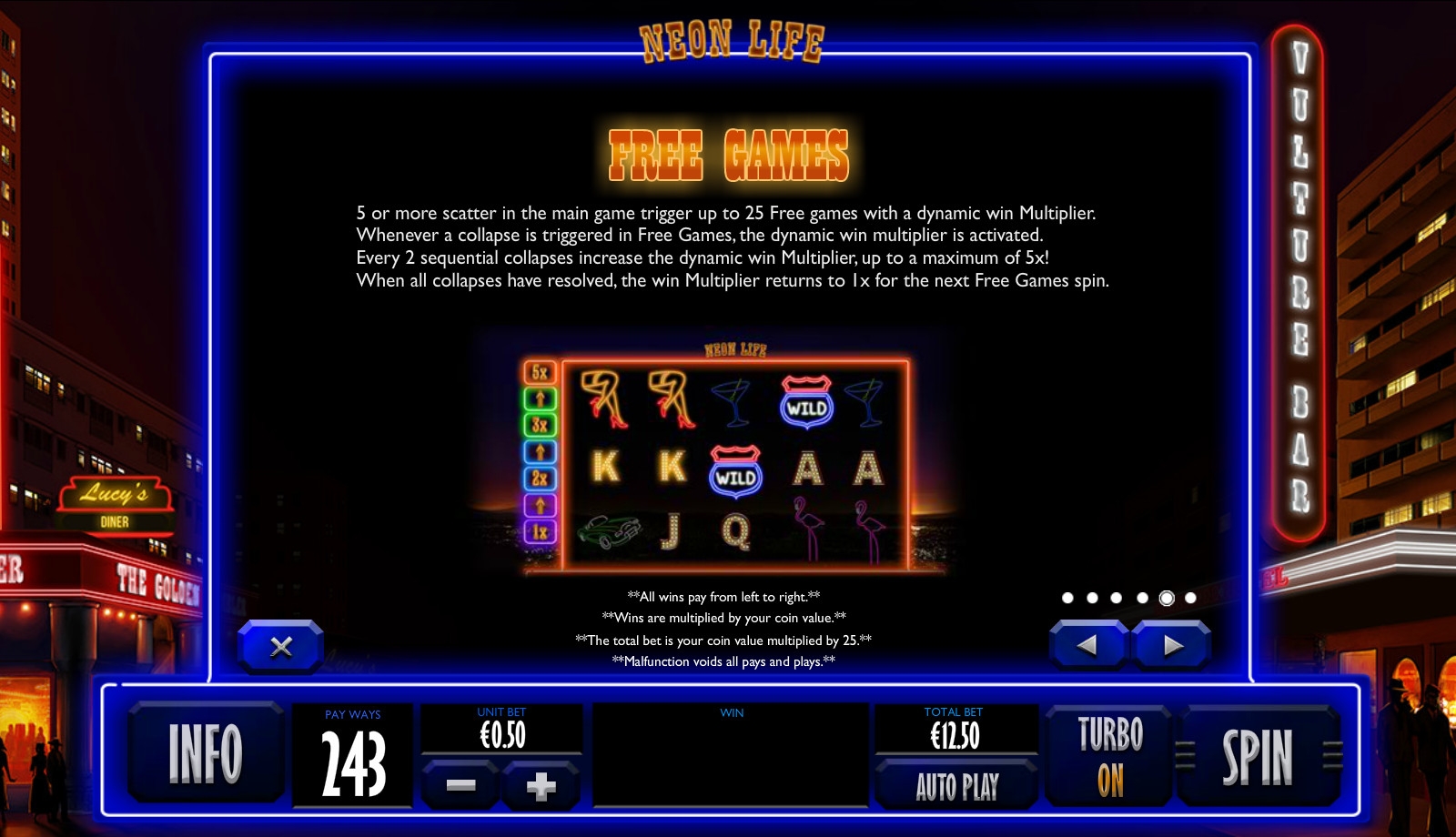 Когда спин завершается, игрок получает выплаты по всем сформировавшимся комбинациям. Раунда на удвоение нет, поэтому деньги сразу выводятся на счет. Всего в Neon Life предусмотрены 243 способа начисления выигрышей по разным видам цепочек.