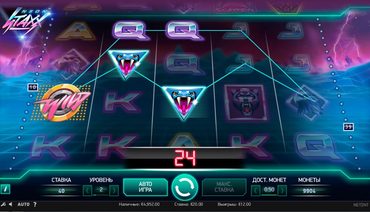 На экране пятибарабанной игры Neon Staxx одновременно помещаются двадцать картинок, расположенных в четыре ряда.