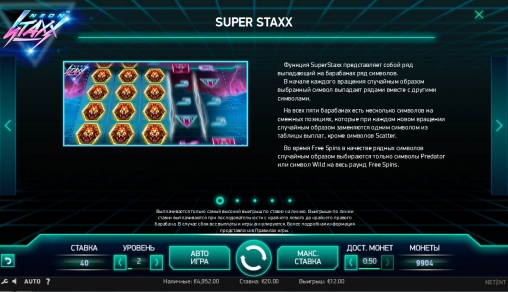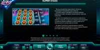 Призовая опция Super Staxx может начаться сама собой в любом случайно выбранном спине. Одна из обычных картинок, изображенных на барабанах, может занимать все позиции по вертикали в отдельно взятой колонке. Так как произойти подобное может сразу на нескольких барабанах, все двадцать ячеек могут быть заполнены одинаковыми символами. Это означает, что игрок станет обладателем максимально возможного количества комбинаций в одном раунде.