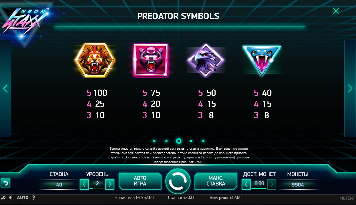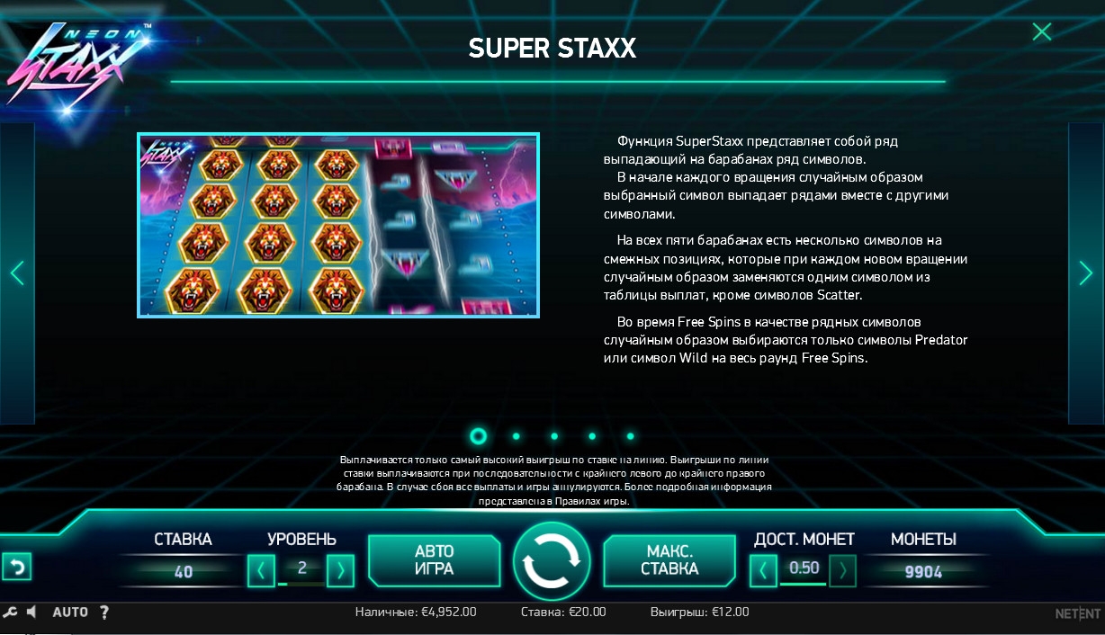 Софт компании NetEnt предлагают многие солидные интернет-порталы. Так, запустить игровой автомат Neon Staxx без регистрации в демо-версии вы сможете в онлайн-казино Next. Бесплатно протестировать модель также можно прямо на Casinoz.