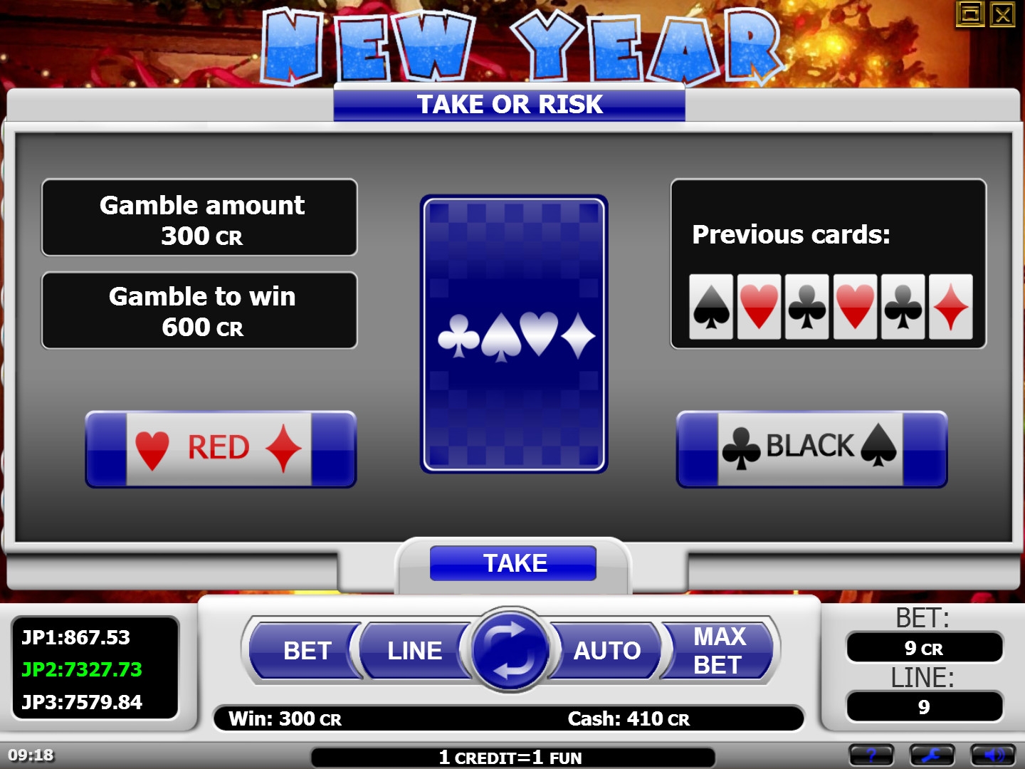 Все полученные за раунд кредиты можно попытаться преумножить в игре по шансам. Она запускается на дополнительном экране, где нужно угадывать цвет карты. Правильно ответите – выплата удвоится. Ошибка приводит к проигрышу денег. Играть можно несколько раз подряд, но деньги разрешается забирать на любом этапе.