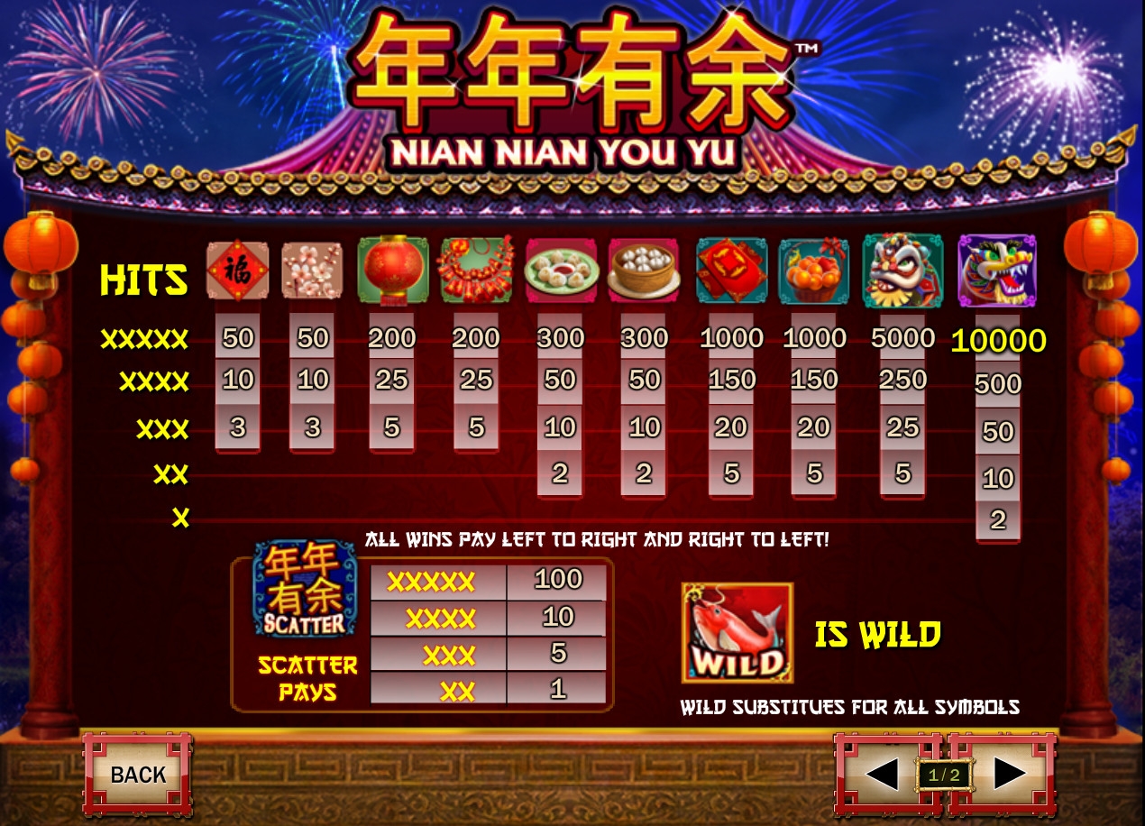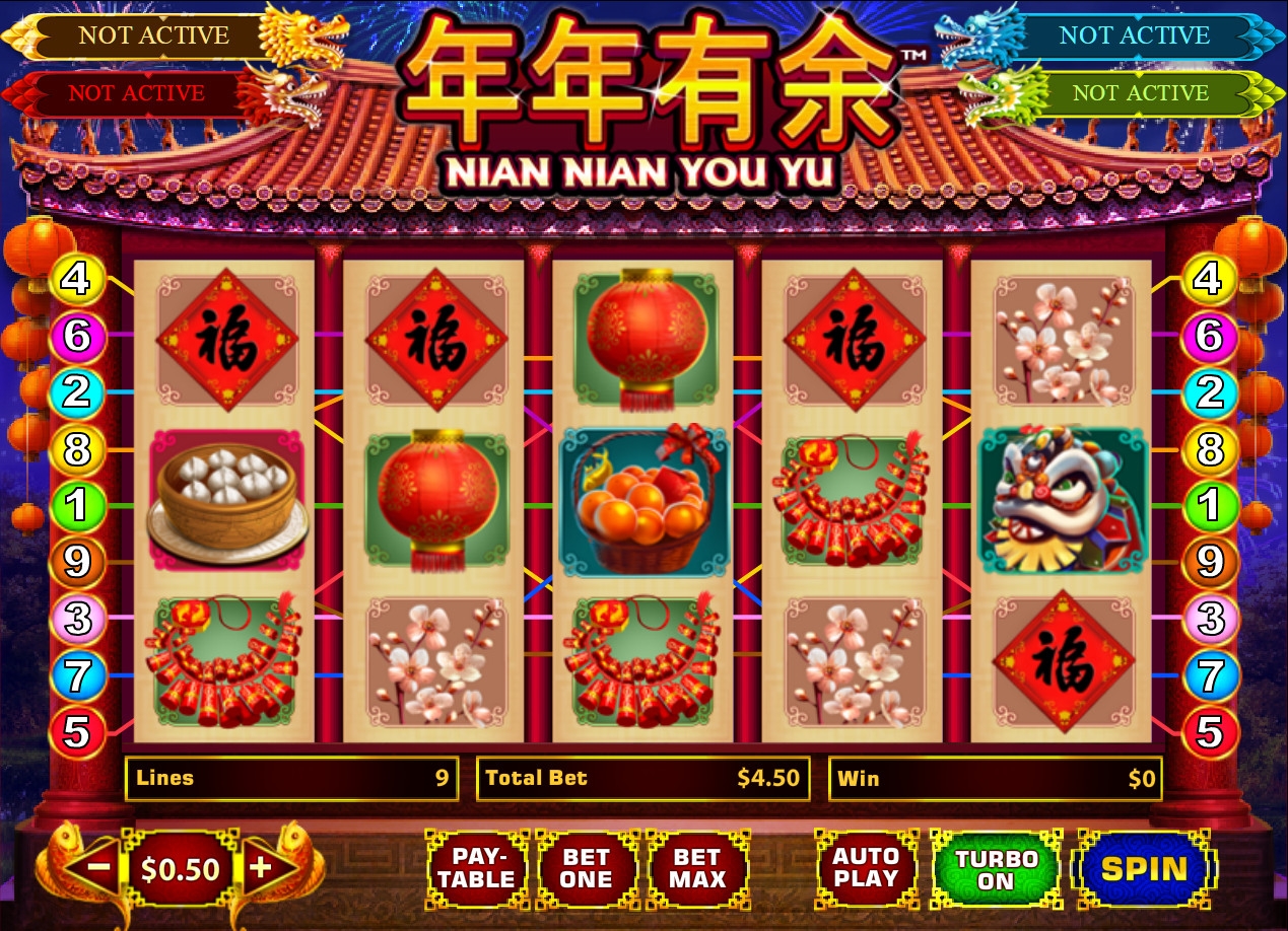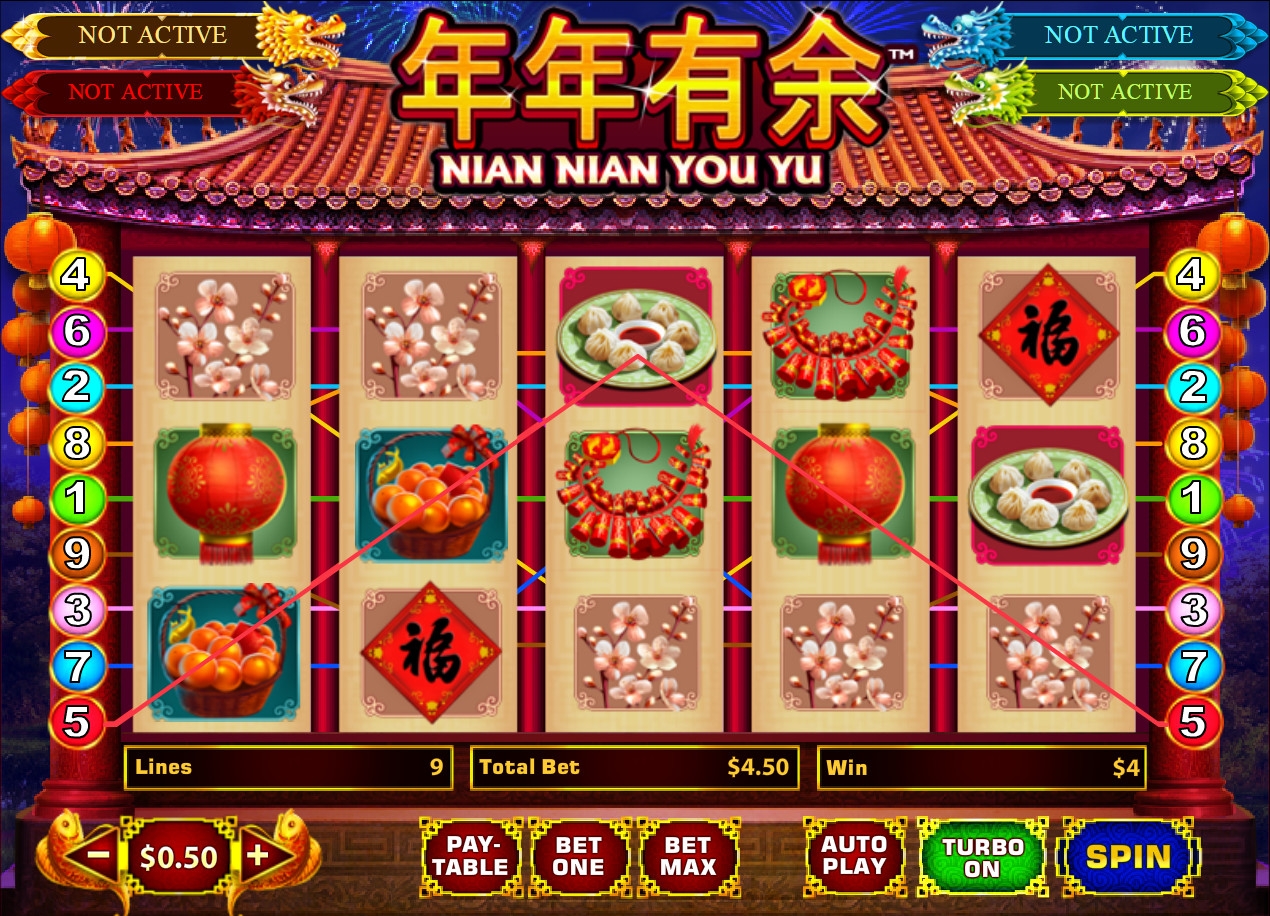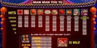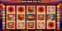 Nian Nian You Yu – это пятибарабанный игровой автомат, доступный для бесплатного тестирования и реальной игры на деньги. Комбинации здесь образуются максимум на девяти линиях, но клиент может задействовать их не все. Картинки на главном экране располагаются в три ряда.