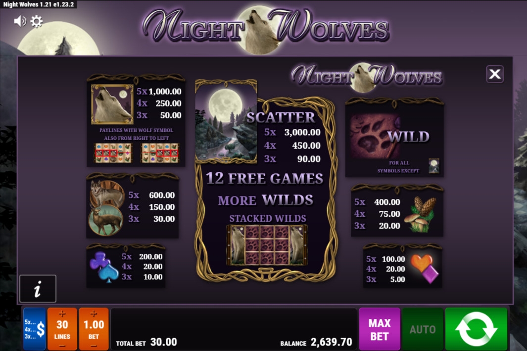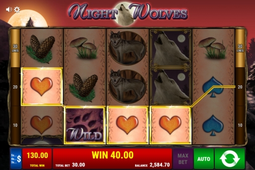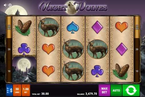 На пятибарабанном автомате Night Wolves можно задействовать десять, двадцать или тридцать линий. Картинки на экране выстраиваются в три ряда.