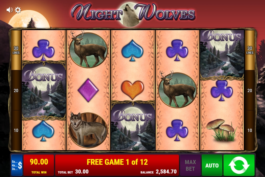 На экране видео-слота Night Wolves появляются карточные масти, волки, олени, грибы и шишки. Воющий на луну волк идет полосами в колонках. Он составляет цепочки слева направо и справа налево.