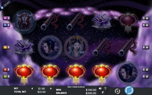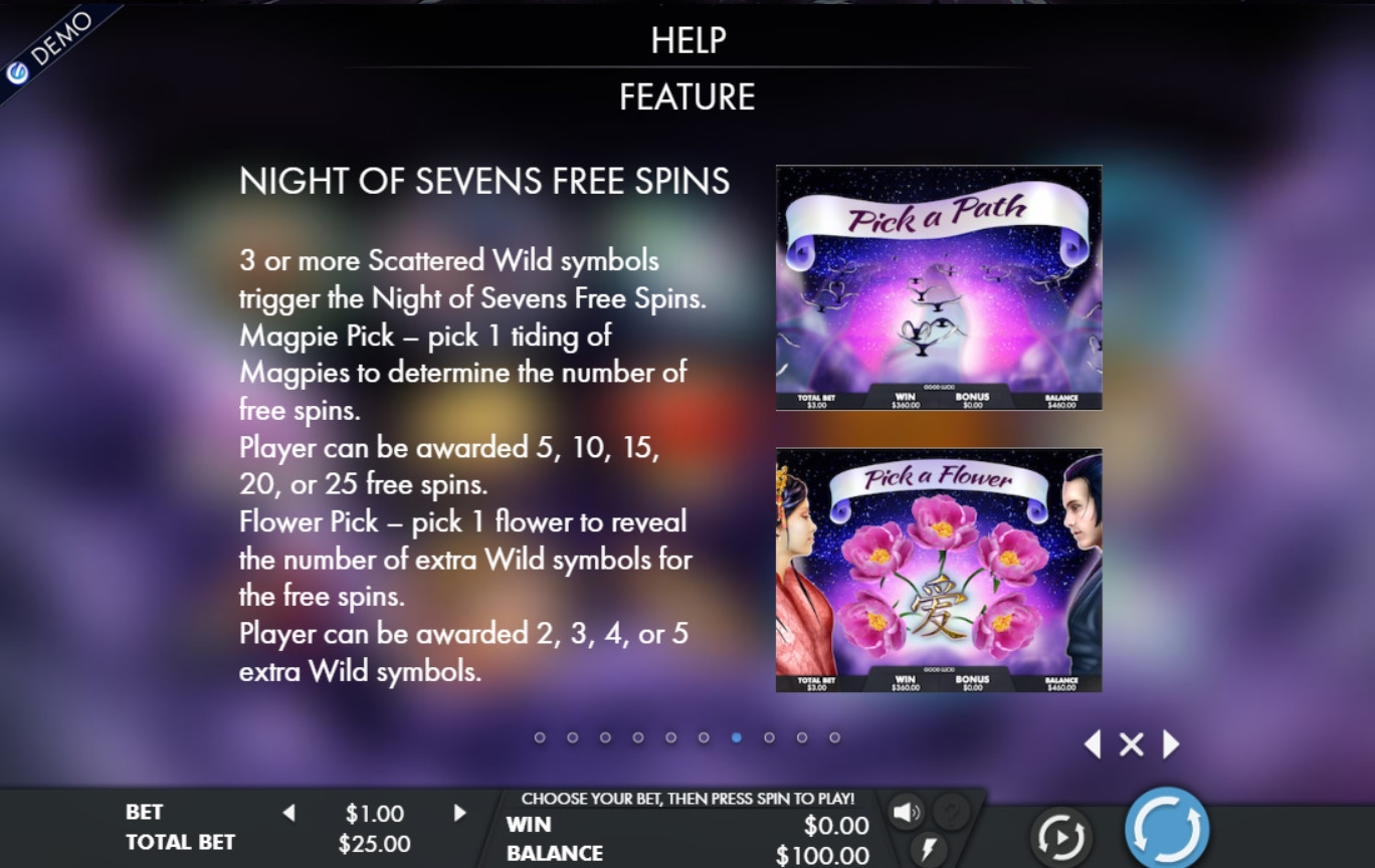 На барабанах видео-слота «Ночь семерок» изображены действующие лица мифической истории, участвовавший в тех событиях бык, китайские фонарики, шпилька Богини Неба, свирель пастуха, элемент ткацкого станка Чжинюй и прекрасный цветок.
