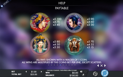- Scatter (табличка с иероглифом) отличается от прочих элементов тем, что не связан с активными полосами и составляет выигрышные комбинации независимо от расположения. При этом выплаты рассчитываются по общей ставке. От трех скаттеров запускают фри-спины