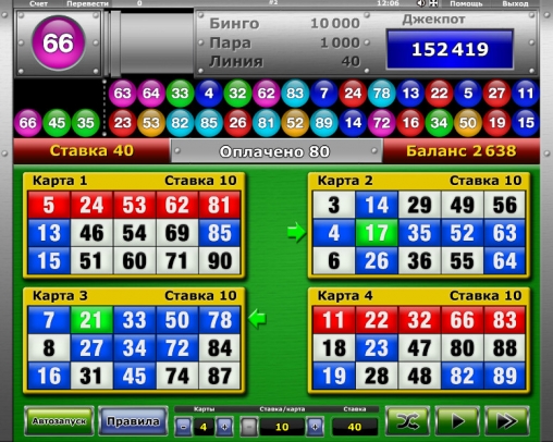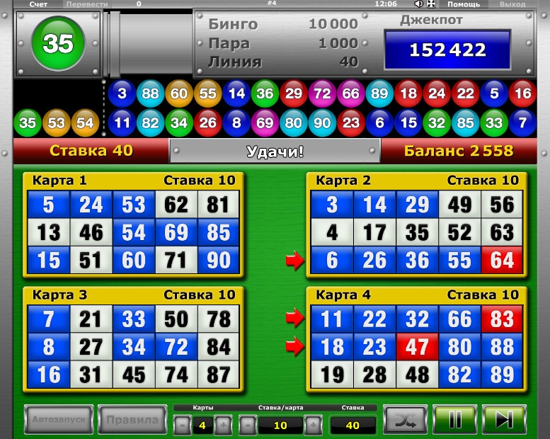 Играть в бинго можно по одной – четырем карточкам. На каждую из них принимается ставка в диапазоне от десяти кредитов до двух с половиной тысяч кредитов. Максимальная ставка на раунд может достигать десяти тысяч кредитов.