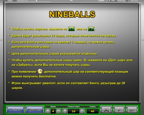Непосредственно в Nineballs Bingo есть окно с краткими правилами. Более подробно особенности игры объясняются в отдельном справочном разделе.