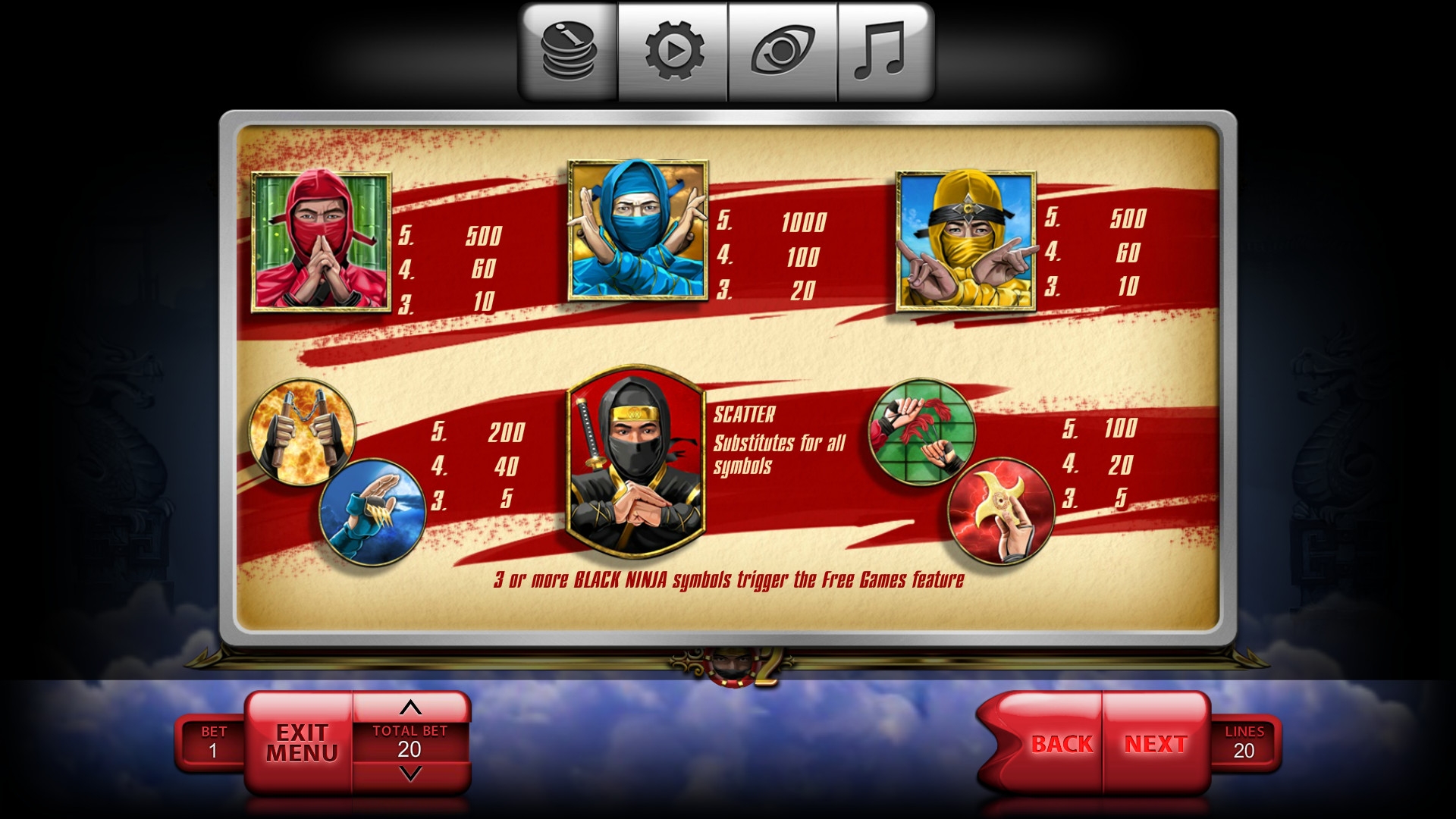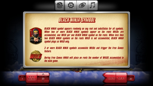 «Ниндзя» - азартный игровой автомат для бесплатного тестирования или реальной игры на деньги, в котором пять барабанов, двадцать линий и три ряда символов на экране. При этом клиенты могут задействовать любое количество полос из числа доступных.