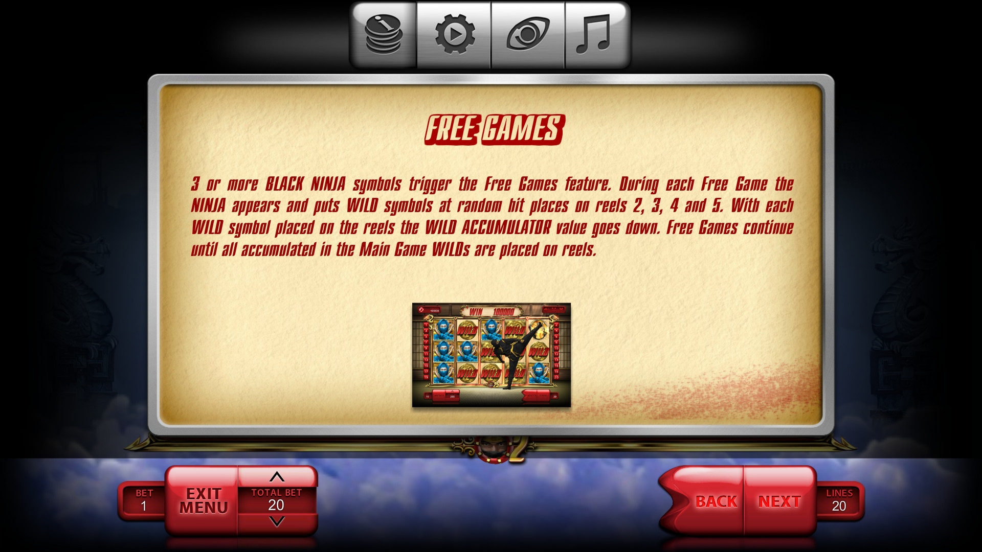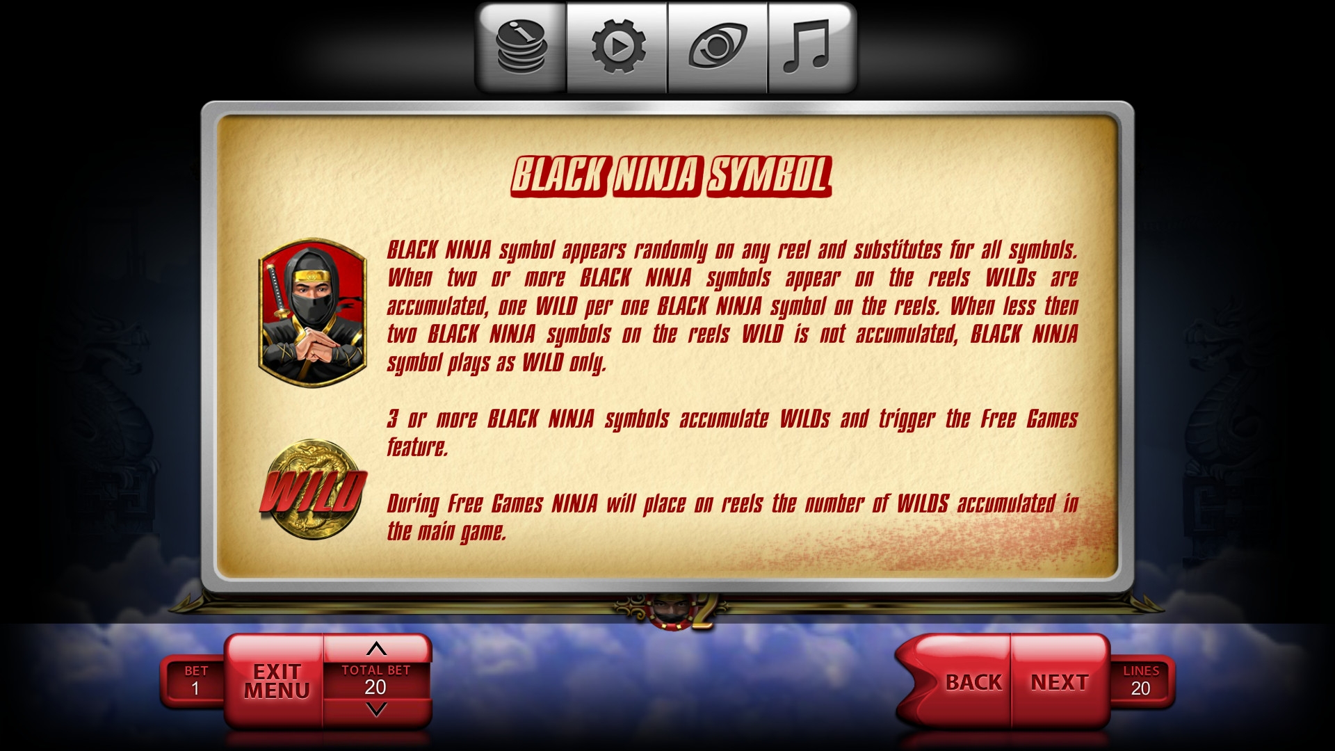 Wild (черный ниндзя) выпадает во всех колонках, но комбинации не формирует. Он заменяет другие символы, если в этом есть необходимость. Все появившиеся на экране Wild накапливаются, что отображается на специальном счетчике.