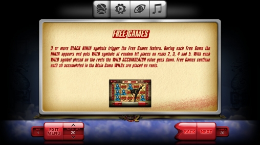 От трех Wild, оказавшихся одновременно где-нибудь на барабанах, дают старт фри-спинам, в которых ставку за клиента делает казино. В каждом из этих запусков ниндзя помещает на первом – четвертом барабанах несколько дополнительных «диких» картинок в виде монет. При этом количество накопленных Wild уменьшается. Спины продолжаются, пока не обнулится счетчик.