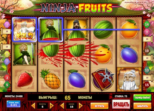 Ninja Fruits – пятибарабанный видео-слот, посвященный ниндзя. В нем пять барабанов, пятнадцать линий (их количество активируется по усмотрению пользователя) и три ряда картинок на экране.
