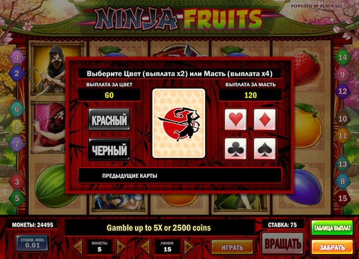 В бонусной игре вы будете бросать сюрикены по фруктам, зарабатывая за это призовые выплаты. Раунд закончится, когда вы промахнетесь. Выигрыши при этом сохраняются.