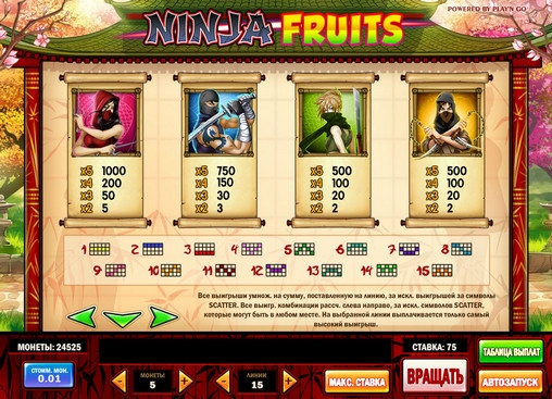 Игровой автомат Ninja Fruits доступен на русском языке, что облегчает знакомство с ним. К тому же, под барабанами есть информационная строка, в которой появляются подсказки. Все нюансы игрового процесса подробно расписаны в справочном разделе (кнопка с вопросительным знаком). Вкратце правила описаны в таблице выплат.