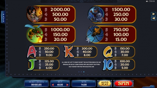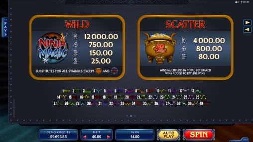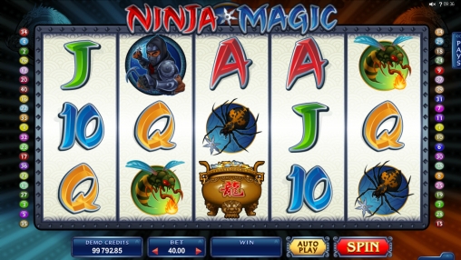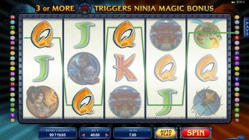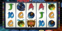 «Магия ниндзя» представляет собой игровой автомат с пятью барабанами и пятнадцатью символами на экране. Задействовать можно до сорока линий, на которых будут формироваться выигрышные цепочки.
