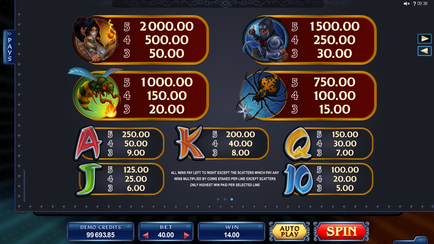 На экране слота вы увидите двух воинов-ниндзя: мужчину и девушку. Также на барабанах изображены оса, паук и номиналы игральных карт.