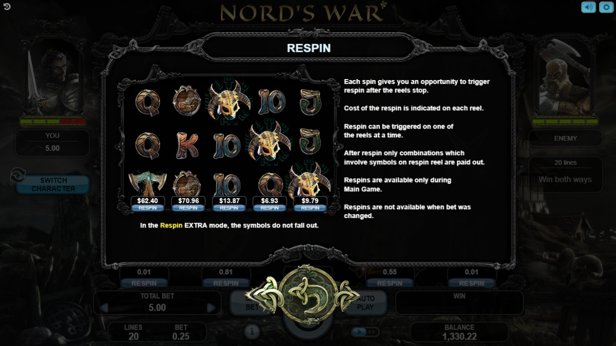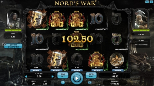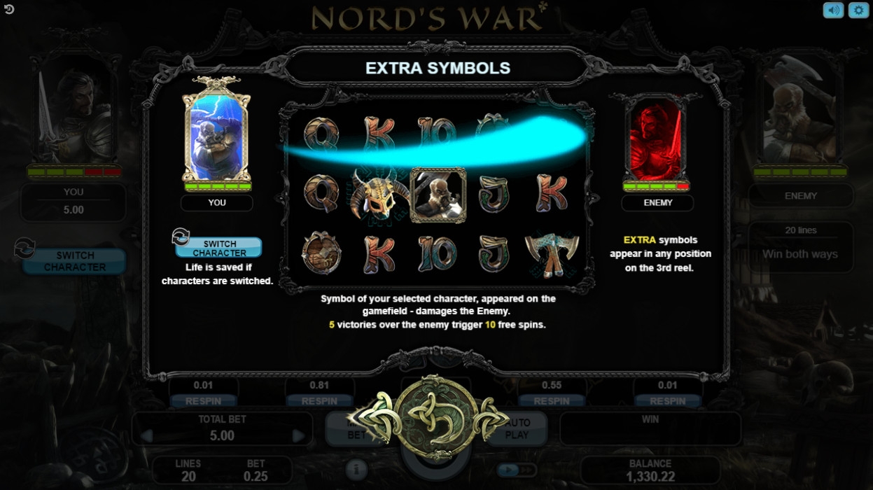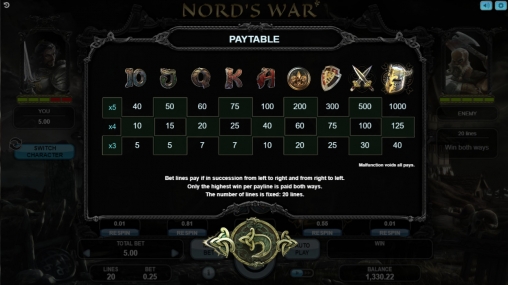 В игровом автомате Nord’s War пять барабанов и двадцать постоянно используемых линий. Картинки располагаются на основном экране в три ряда.