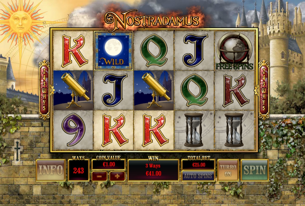 Выигрышные цепочки образуются в Nostradamus из трех и более одинаковых изображений. Картинки должны оказаться в любых ячейках на трех соседних барабанах, стартуя с первой колонки слева. Всего предусмотрены 243 способа получения выплат по базовым символам.