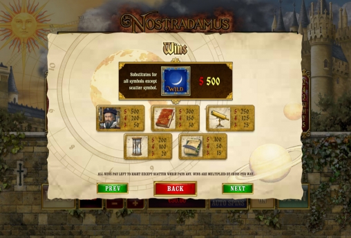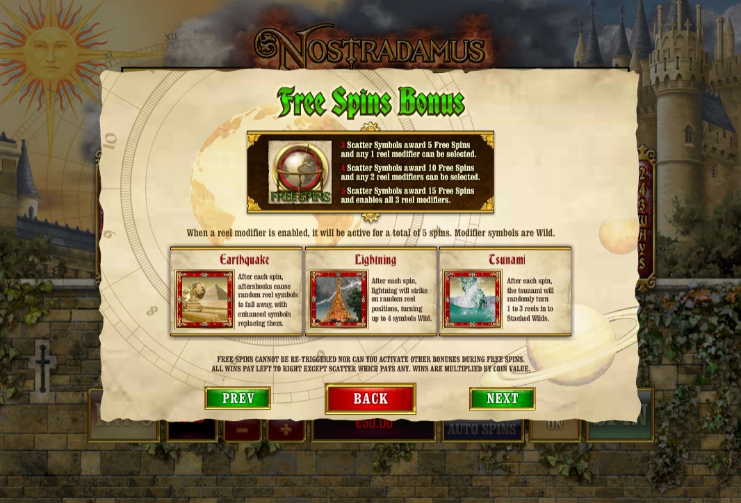 - Бонус Nostradamus Predictions («Предсказания Нострадамуса») может стартовать в любом обычном спине. На экране развернется свиток с каким-то пророчеством Мишеля. В результате, игрок может получить дополнительный множитель для расчета выигрыша, конкретный выигрыш или особую функцию, модифицирующую картинки в символы Wild.