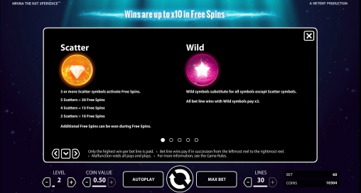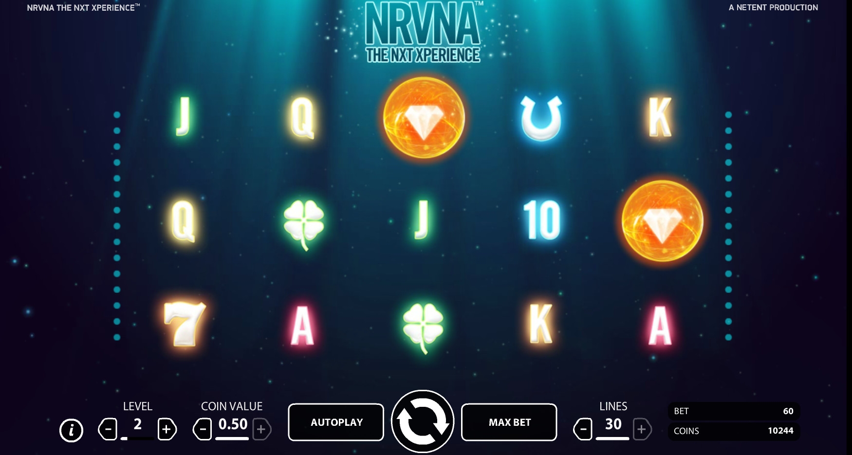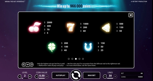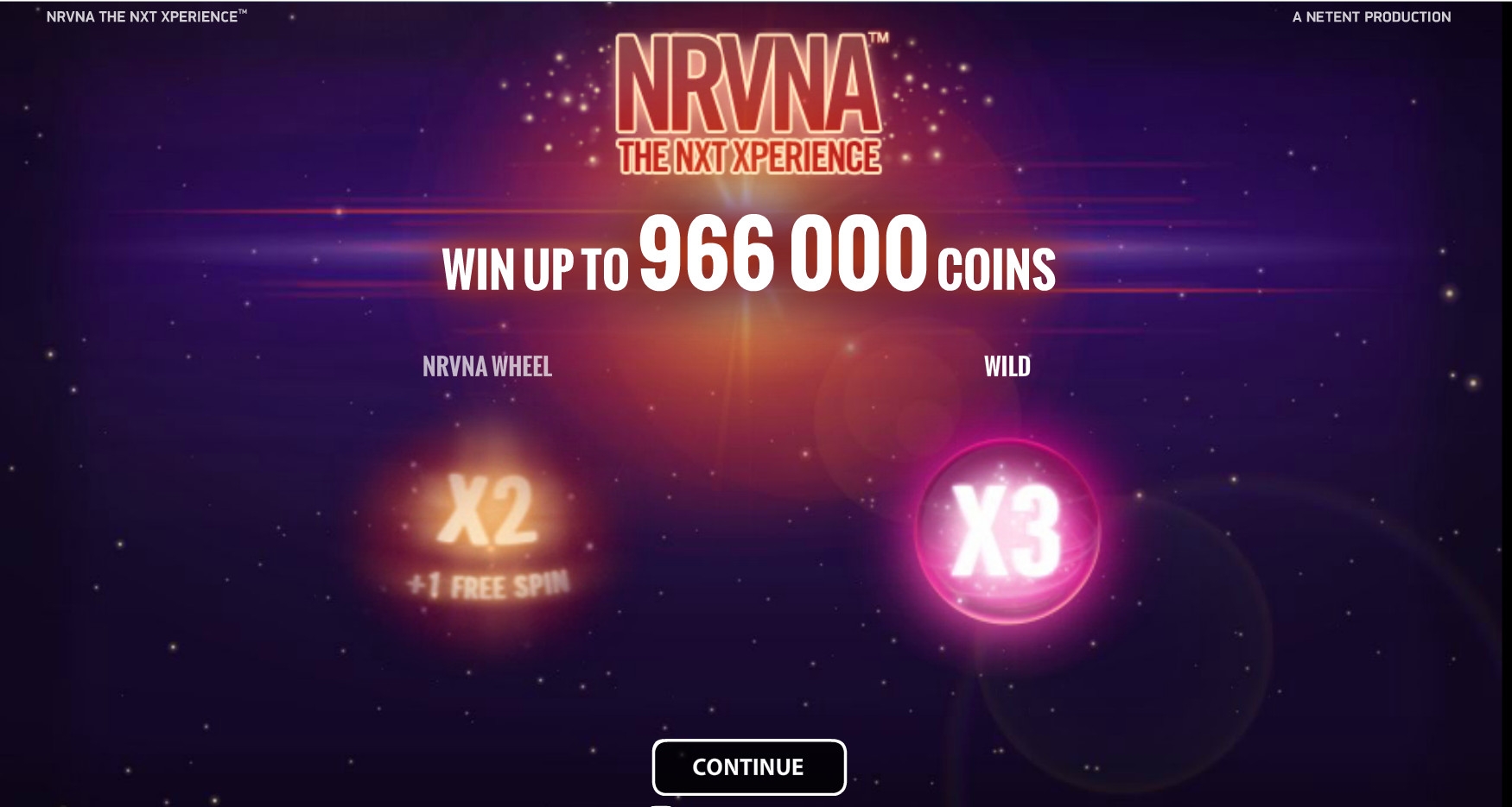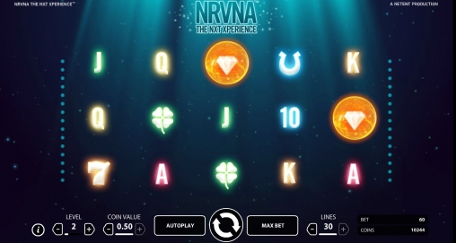 Nrvna: The Nxt Xperience – онлайновый игровой аппарат с тридцатью линиями, пятью барабанами и пятнадцатью картинками на основном экране. Задействовать можно любое количество активных полос от одной до тридцати.