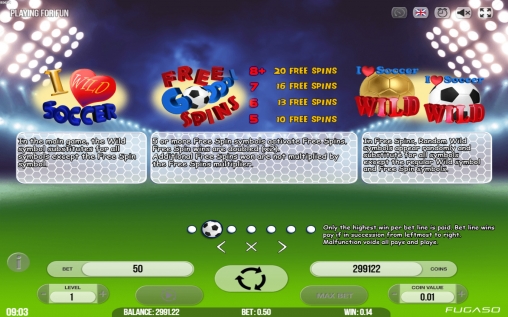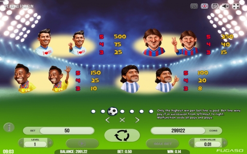 На экране видео-слота появляются Пеле, Роналду, Марадона и Месси. Также на барабанах изображены болельщики, вратарь, бутсы, медали, свисток и карточки судьи.