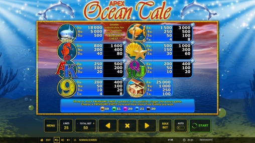 В игровом автомате «Океанская история» пять барабанов и двадцать пять постоянно используемых линий. Иконки располагаются на центральном экране по схеме 5х3.