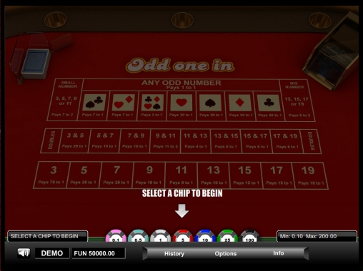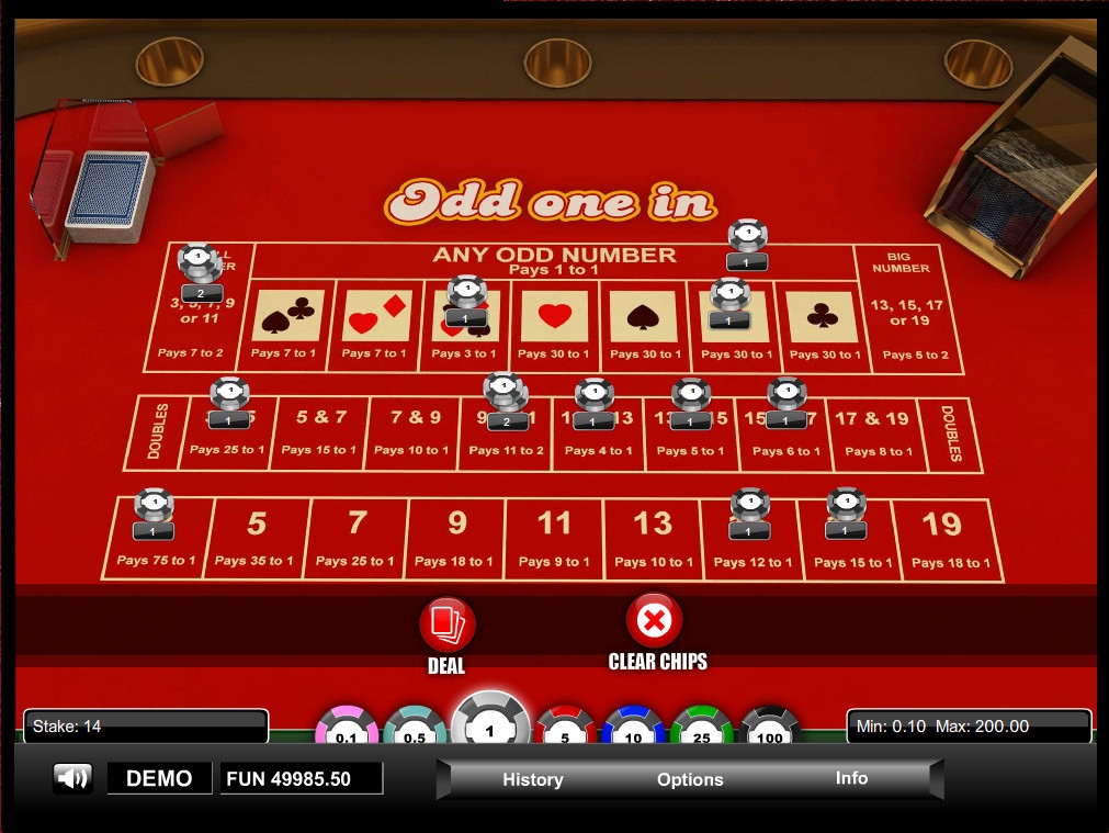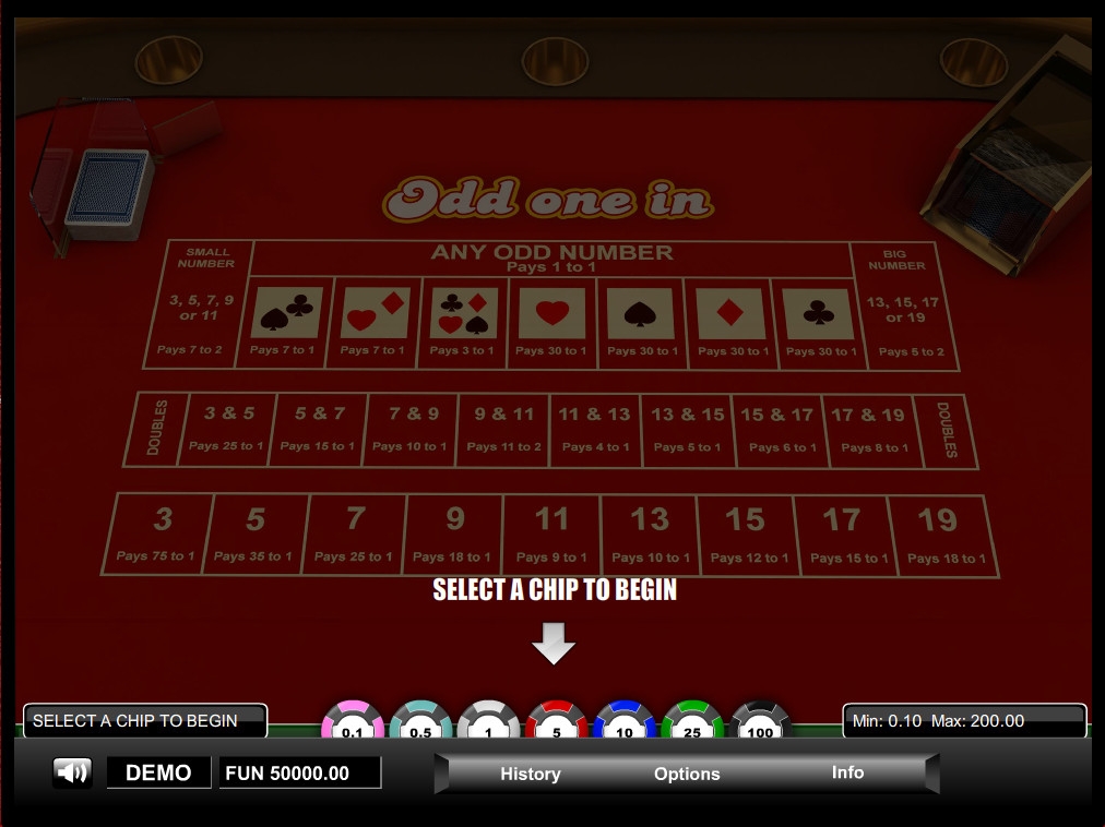 Odd One In представляет собой необычную игру, в которой нужно делать ставки разных типов, пытаясь угадать масти и номиналы двух карт, определяемых случайным образом.