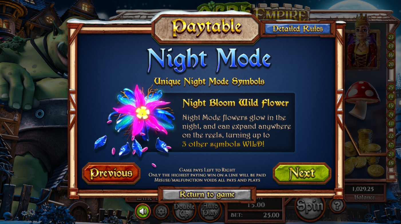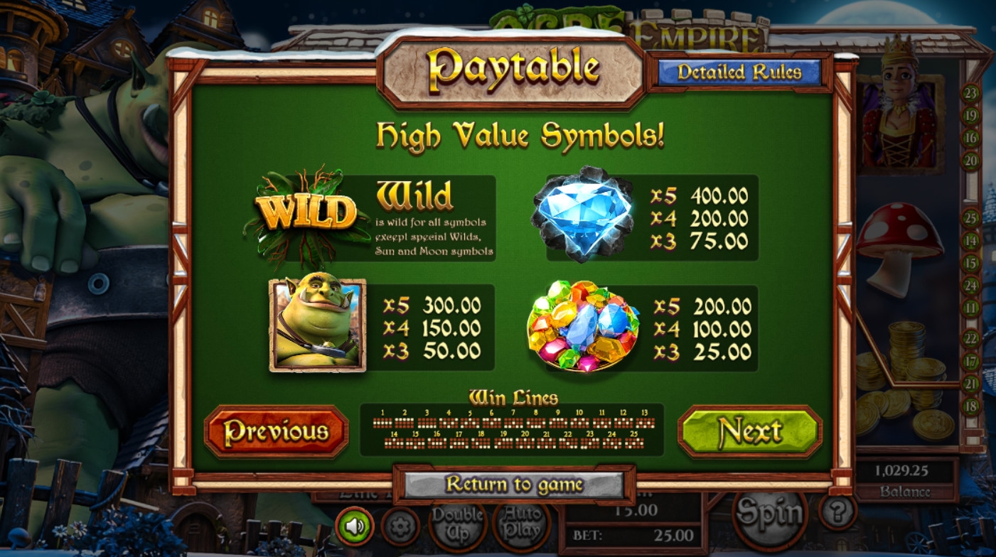 В автомате Ogre Empire задействованы два игровых режима, базовые картинки, особые символы, раунд на удвоение выплаты и несколько тематических бонусов.