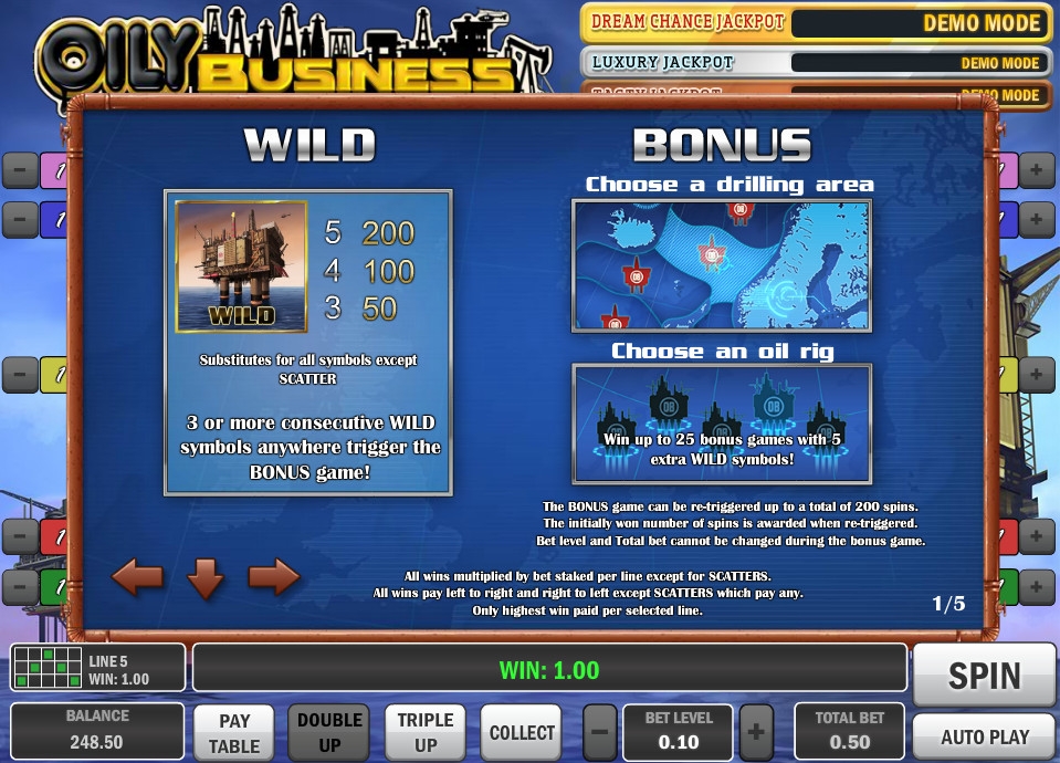 Призовой раунд начинается с того, что вы должны выбрать наугад одну из предлагаемых локаций на карте, а затем указать на одну из доступных нефтяных вышек. Так вы определите количество полагающихся фри-спинов и действующих в них дополнительных символов Wild. Затем начнутся бесплатные вращения, которые могут продлеваться до двухсот подряд.