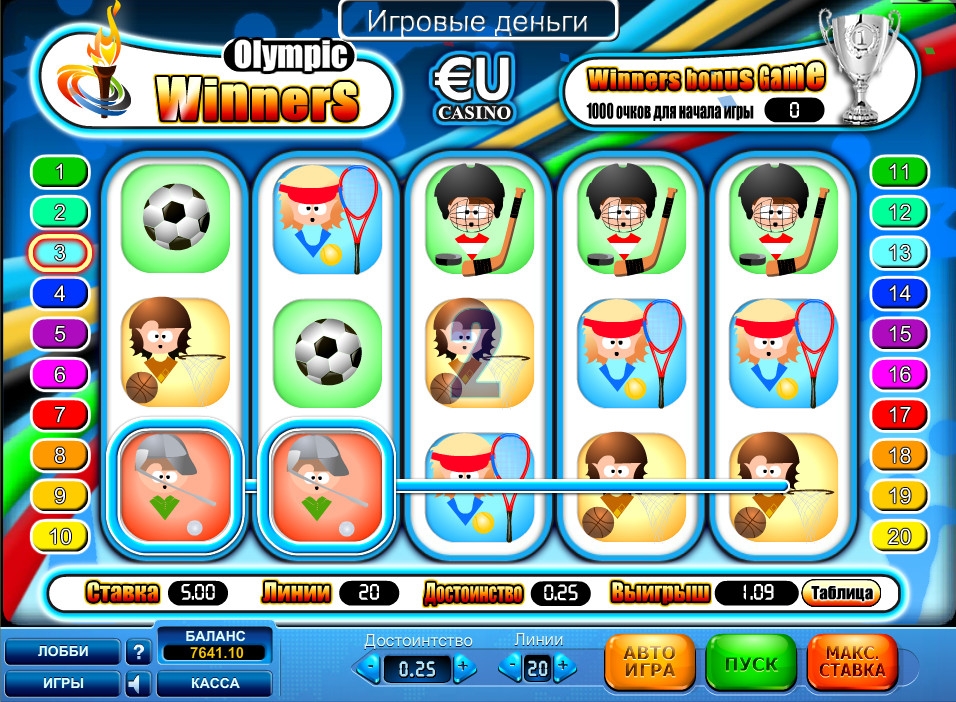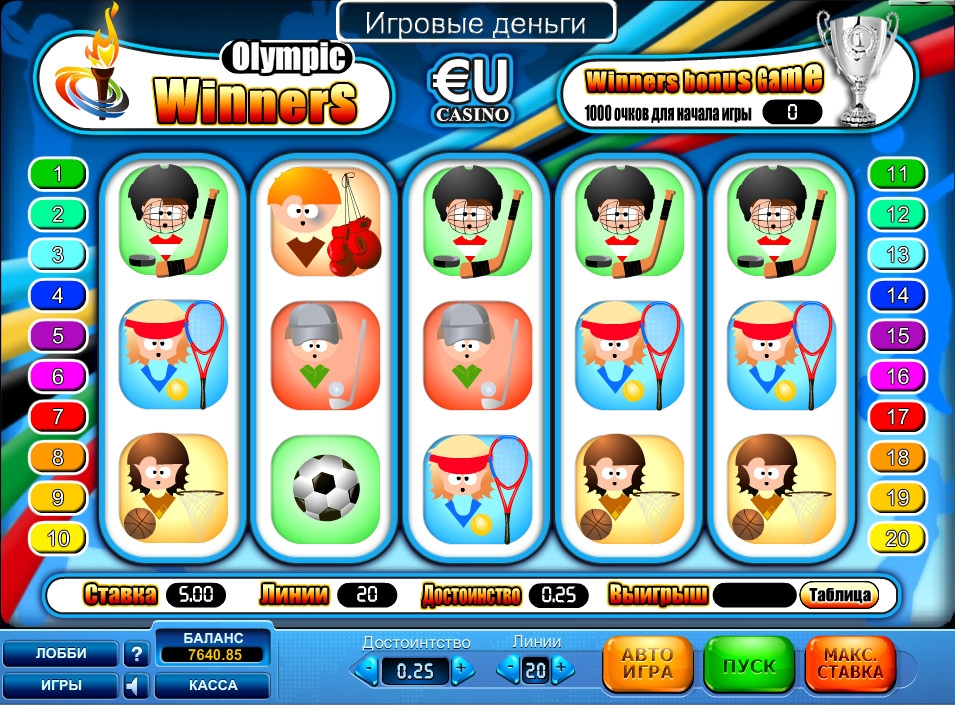 Олимпийские чемпионы (Olympic Winners) не плохой игровой автомат . Очень привлекает красочная графика и дизайн . Хорошая идея с бонусной игрой . Ну и конечно очень надеюсь , что наше молодое поколение , поиграв в данный слот , пойдет заниматься спортом !