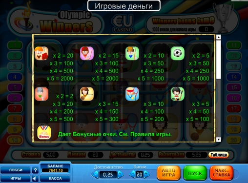 В игровом автомате Olympic Winners пять барабанов и двадцать линий. На каждую из них разрешается делать ставку от десяти центов до десяти долларов. Так что всего на спин можно поставить до двухсот долларов. В слоте предусмотрены специальные символы и тематическая бонусная игра на отдельном экране.