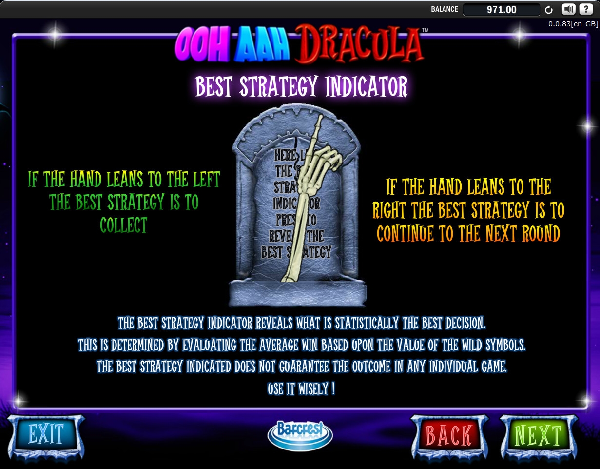 В видео-слоте Ooh Aah Dracula реализована система подсказок по оптимальной стратегии. Программа, анализируя текущие достижения клиента, дает ему подсказку, как поступить по завершению очередного этапа бесплатных вращений. На экране появится костяная рука, высунувшаяся из могилы. Если она склоняется влево, нужно забирать выигрыш. Если она указывает вправо, следует переходить на следующий этап.