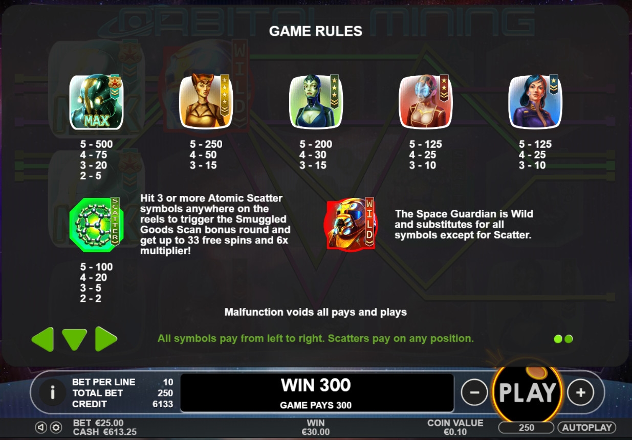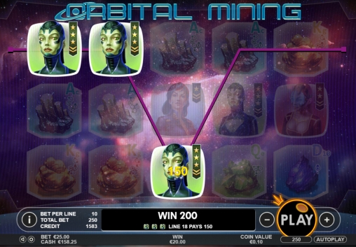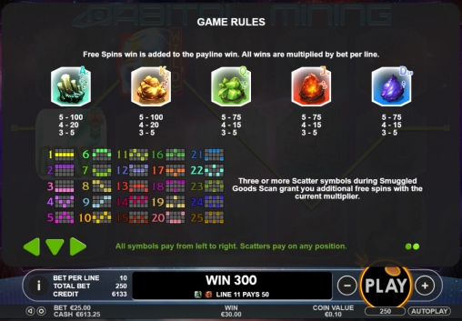 Для расчета выплаты в каждом случае ставка по одной полосе умножается на специальный коэффициент, указанный в таблице для полученной комбинации. В Orbital Mining он бывает от х2 до х500. При нескольких выигрышных вариантах в одном спине кредиты суммируются.