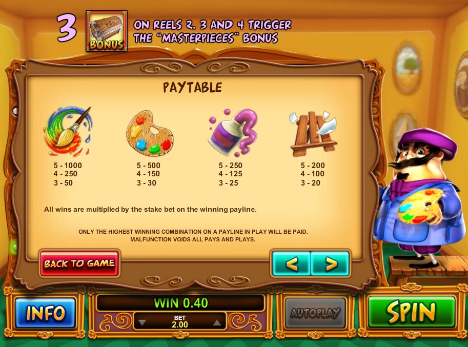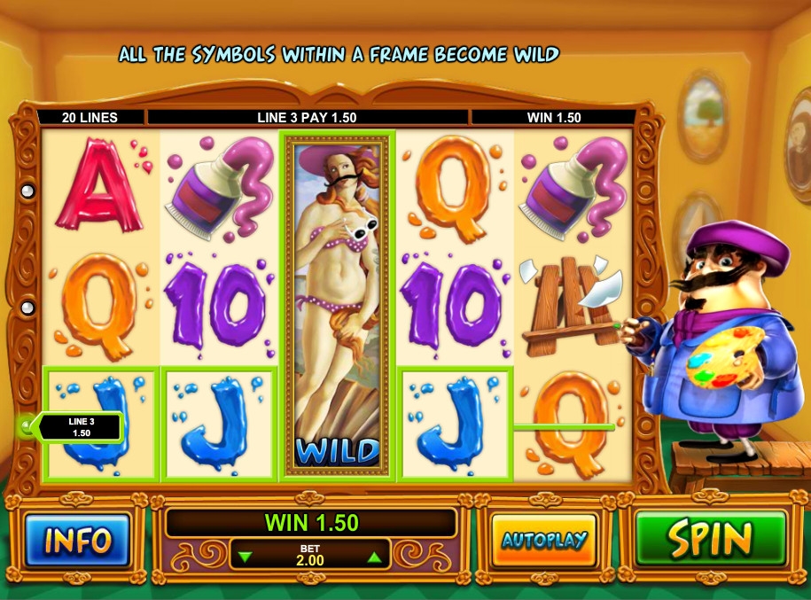 Все сделано по существу, претензий к количеству игровых линий и барабанов нет, так как их хватает, что бы ощутить весь вкус игры. Кроме того автомат сделан в художественном стиле, порадовал персонаж художник с мольбертом в руках. Играть одно удовольствие.