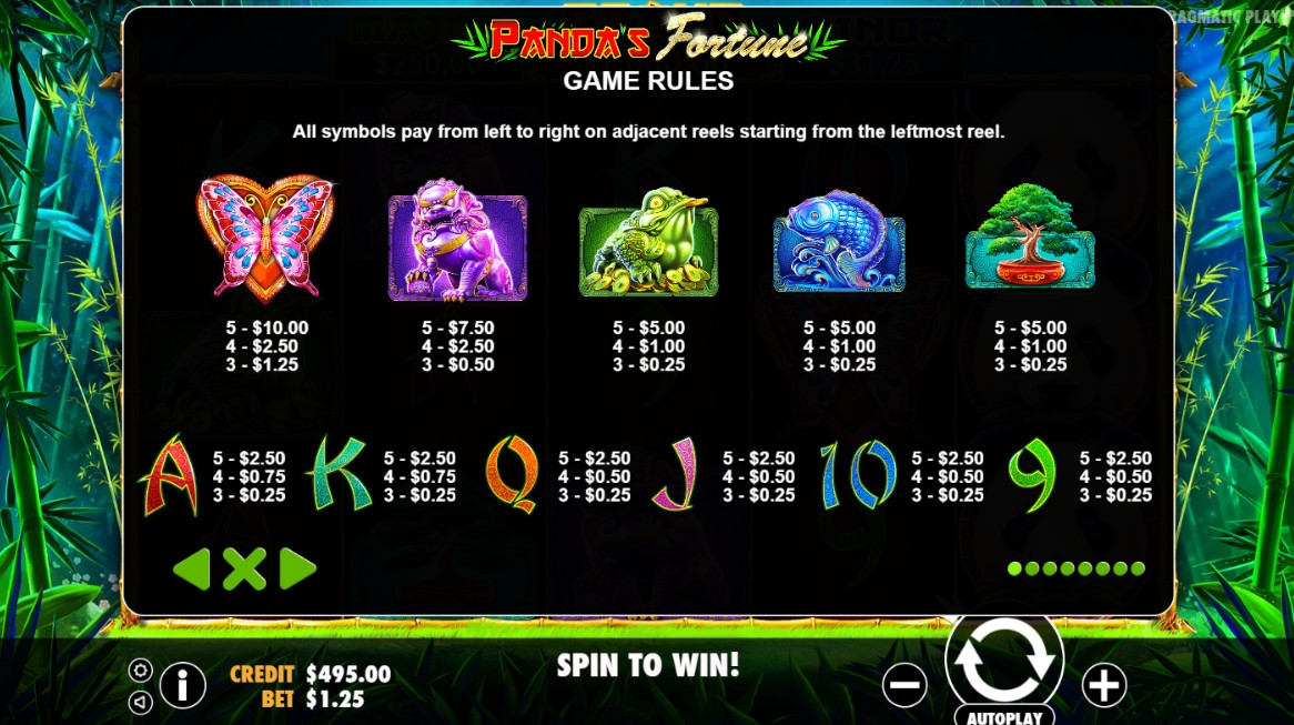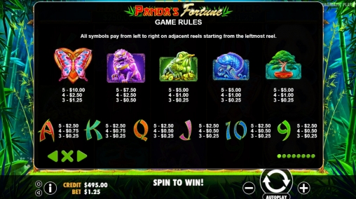 Разработчики предлагают в Panda’s Fortune одиннадцать базовых символов, джокер, скаттер, три джекпота и фри-спины с особыми условиями розыгрышей.