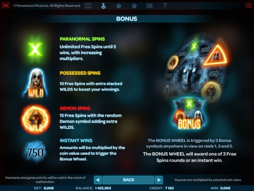 - Paranormal Spins – Неограниченной количество спинов, продолжающихся до пяти выплат. В них действуют увеличивающиеся множители, которые принимаются в расчет при определении суммы выигрыша.