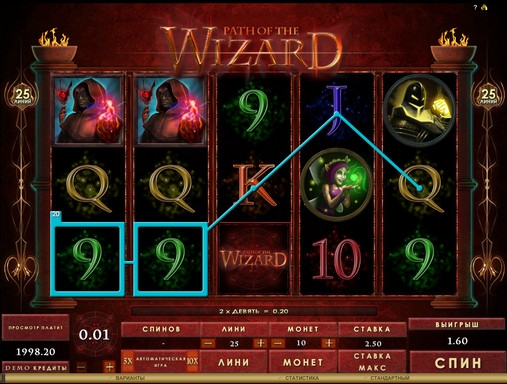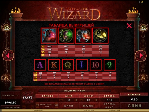 Играть на игровом автомате Path of the Wizard разрешается по одной – двадцати пяти активным линиям (выбор за вами). Ставка на каждую из них может быть от одной до десяти монет номиналом один – десять центов. Несложно подсчитать, что на спин принимается до двадцати пяти долларов.