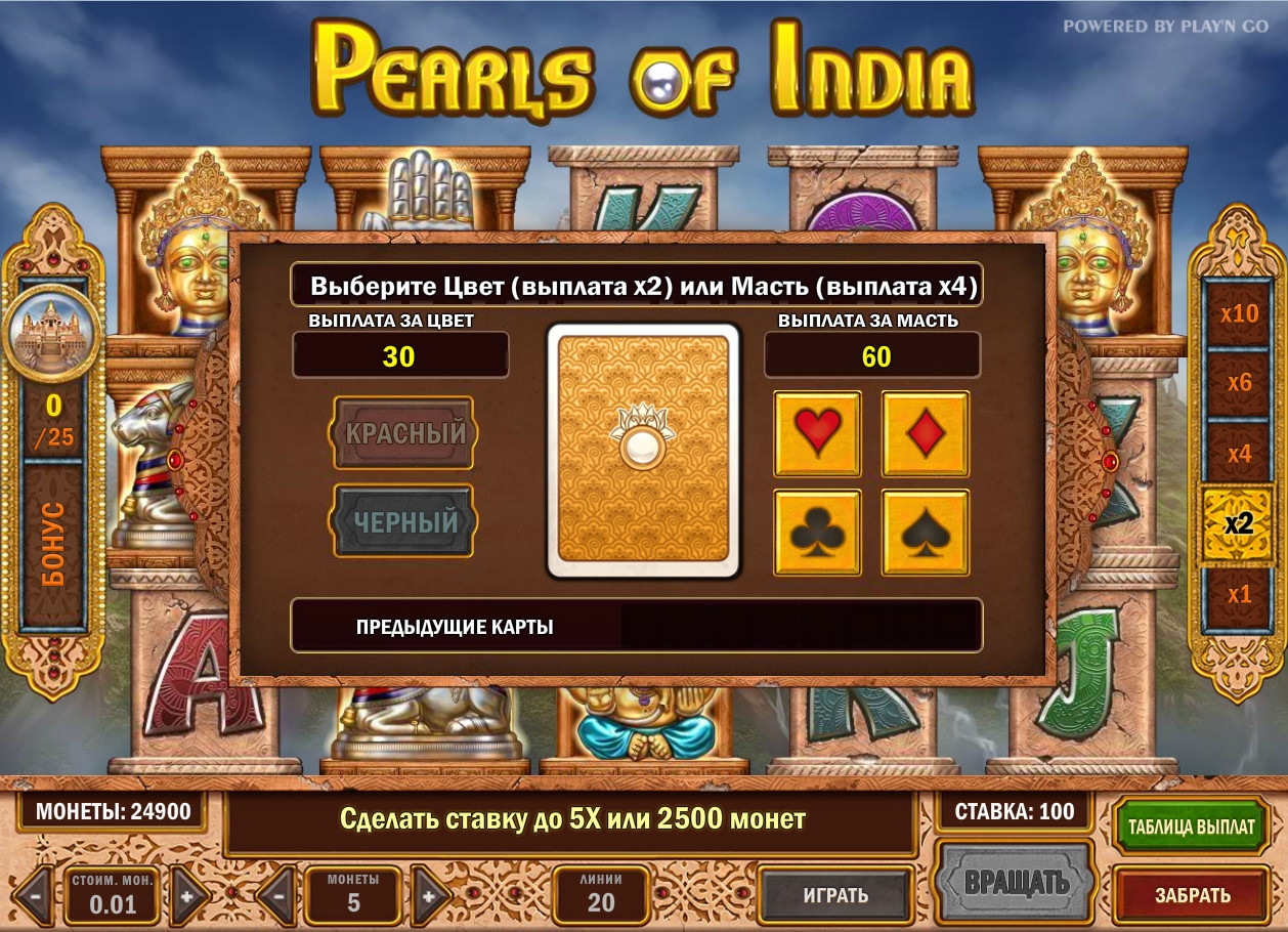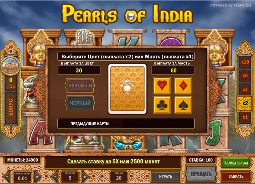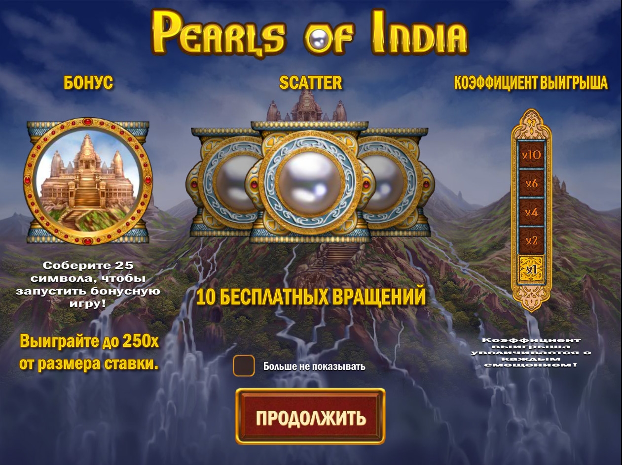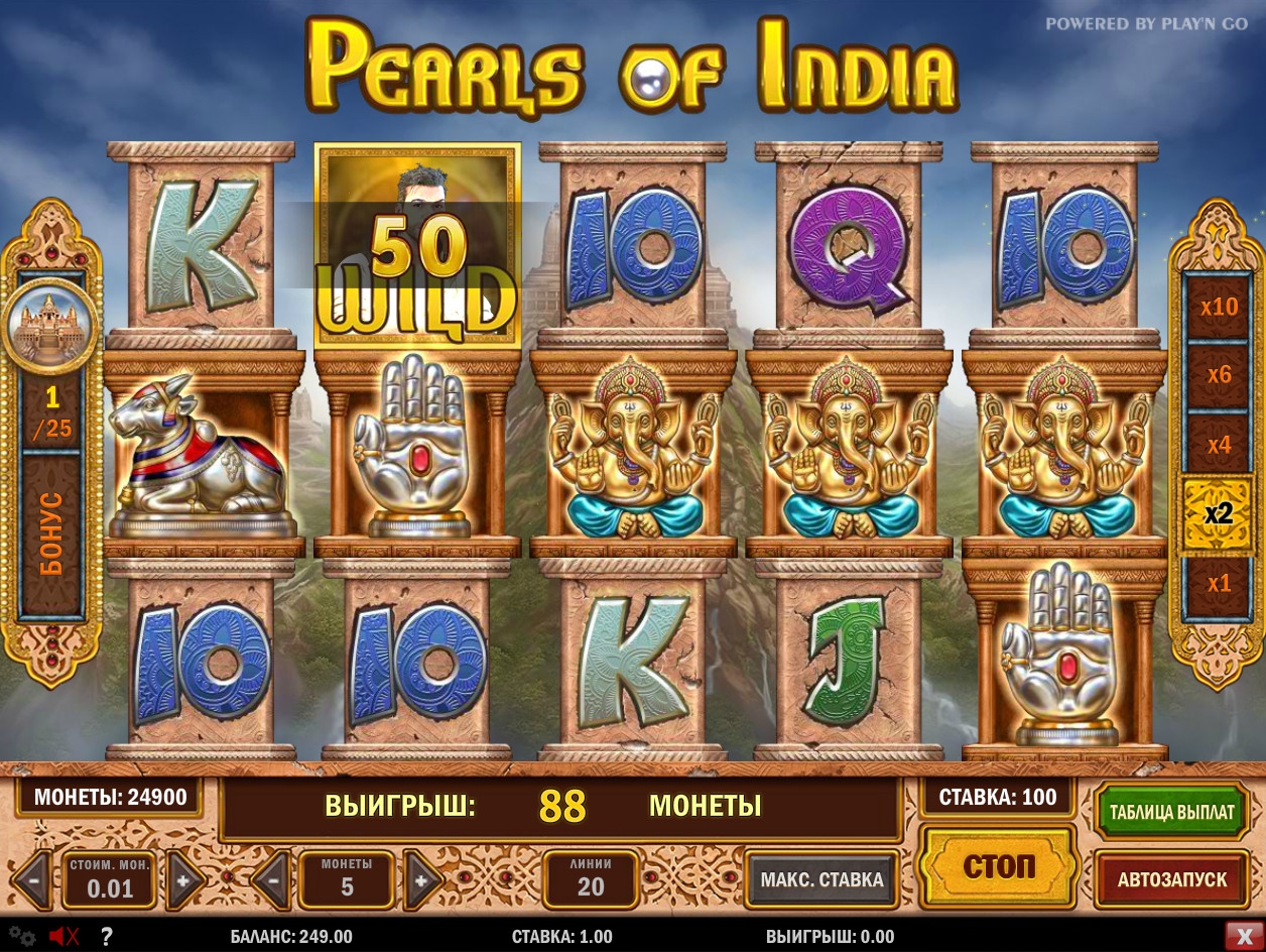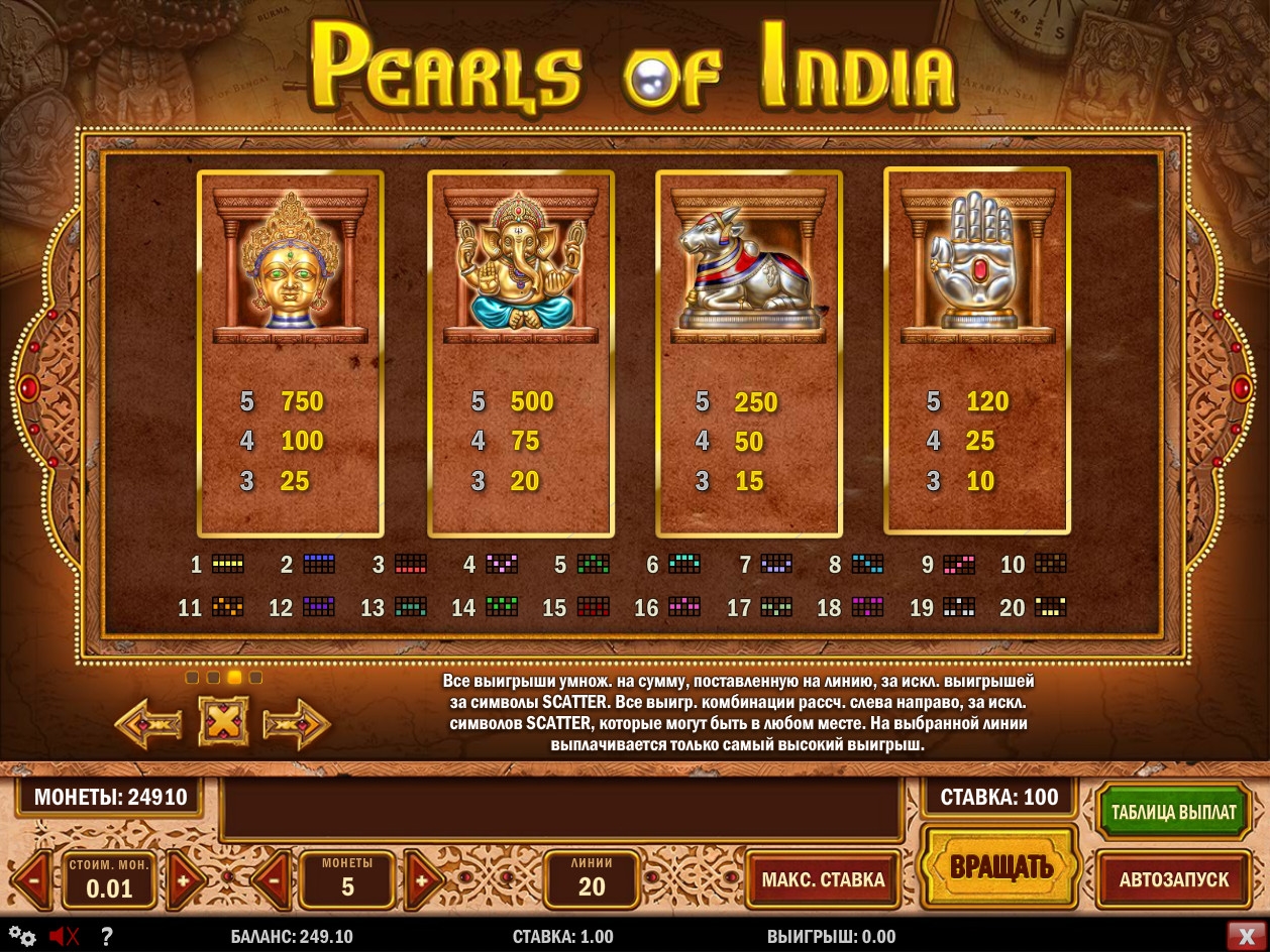 Pearls of India – модель с пятью барабанами, тремя рядами картинок на экране, двадцатью линиями и широким выбором опций, в числе которых специальные символы,